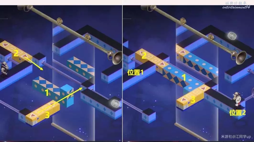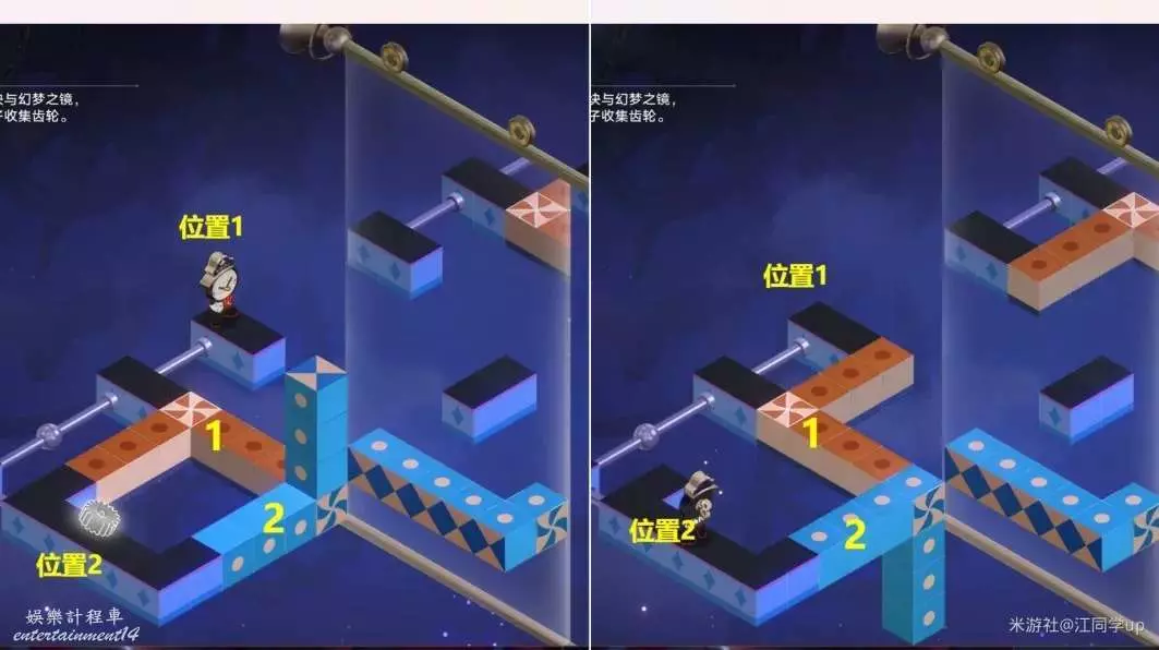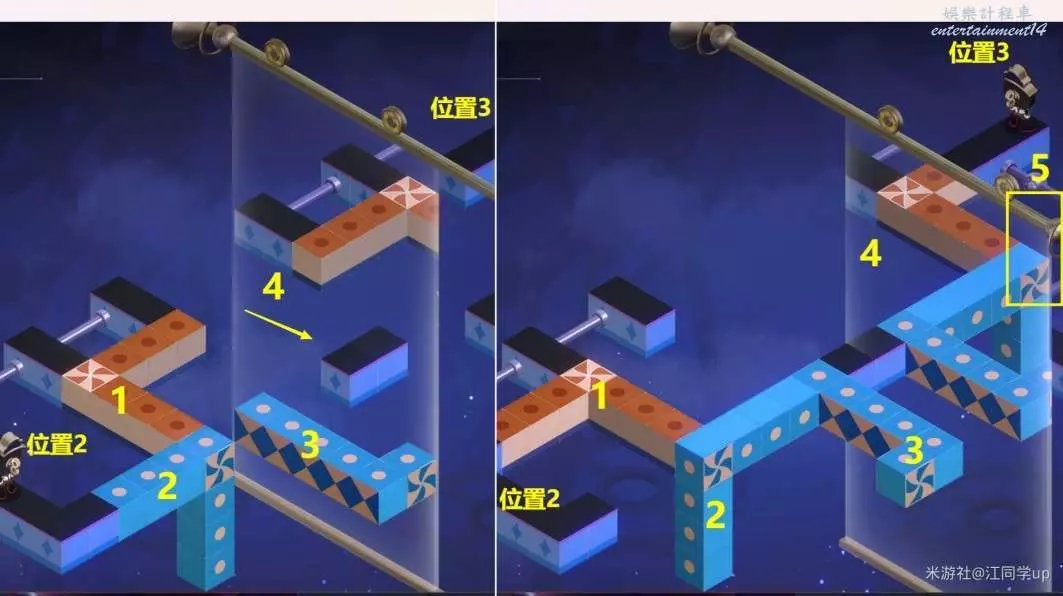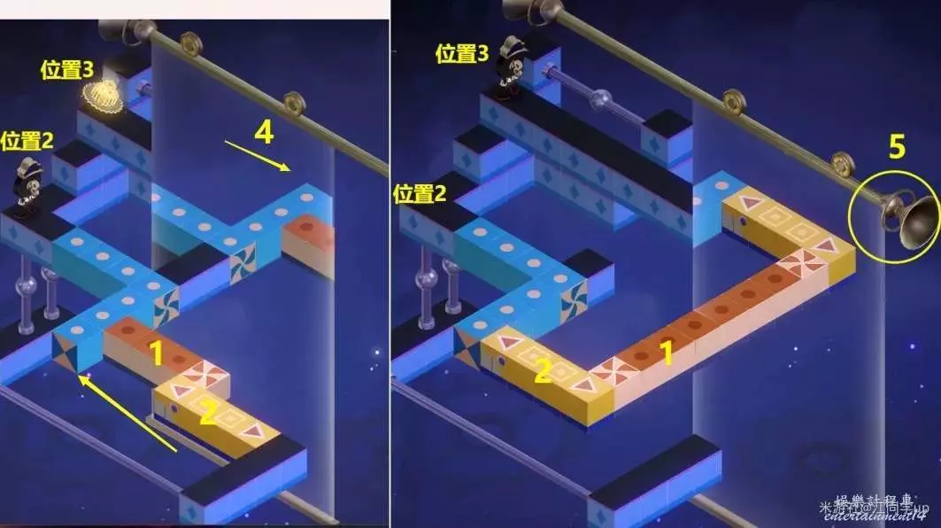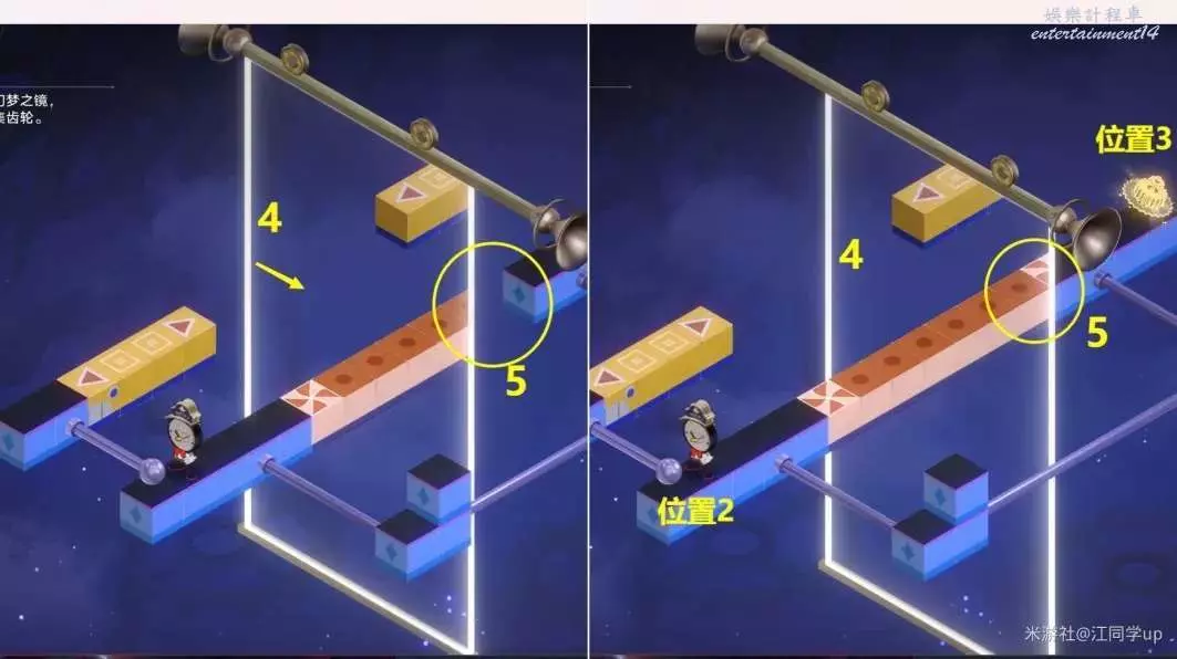 (4)將4鏡子移動到下圖位置,使5位置拼接到一塊後,【鐘錶小子】會從位置2到位置3,解密完成