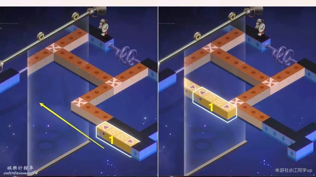 (6)將2黃色模組移動到下圖位置,【鐘錶小子】會從位置2到位置3,解密完成