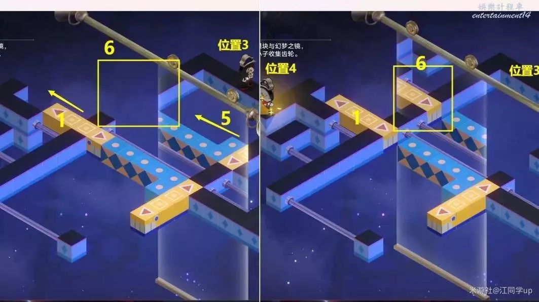 (5)將5鏡子移動到下圖位置,使6位置拼接到一塊後,【鐘錶小子】會從位置3到位置4,解密完成
