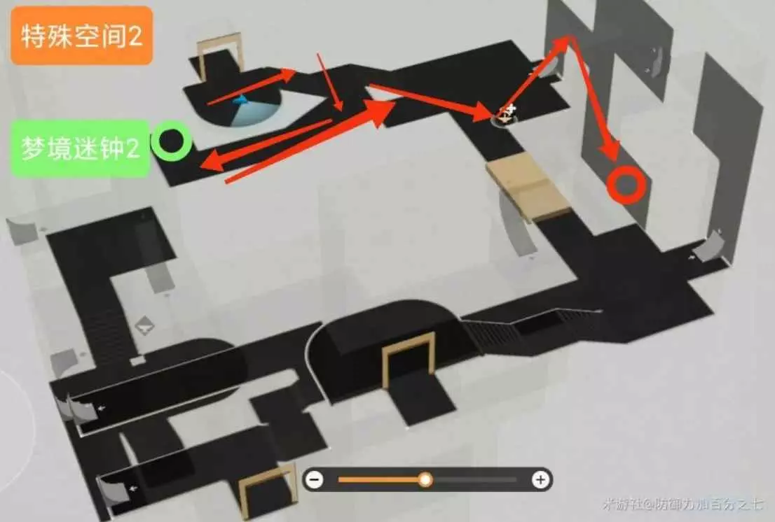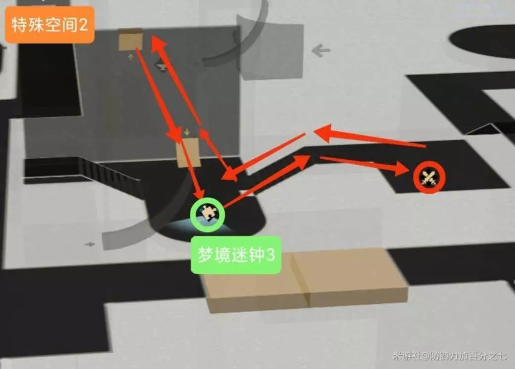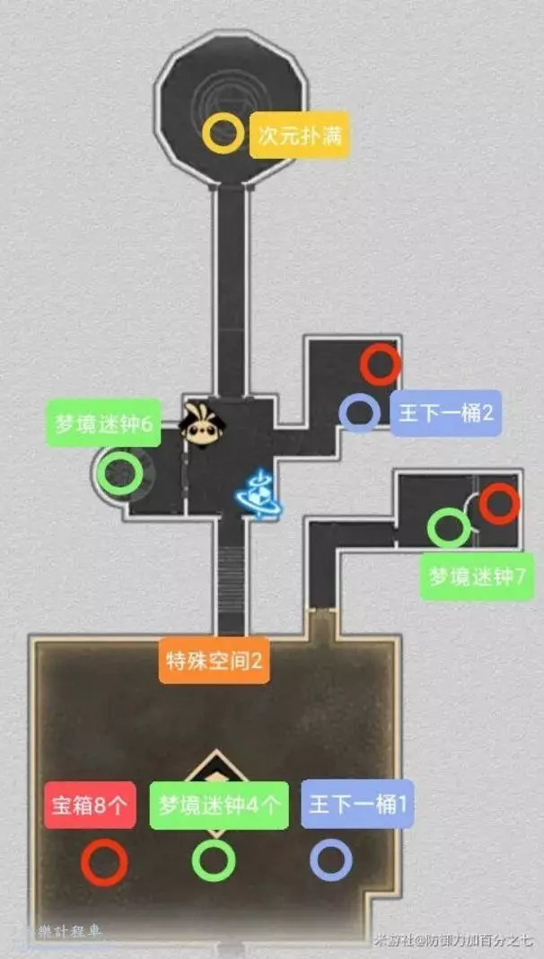 崩壞 星穹鐵道 稚子的夢寶箱收集攻略 16 2 月 2024-02-16 廣告 作者:防禦力加百分之七 來源:米遊社論壇 從稚子的夢這層開始就會出現多個特殊迷宮空間(即夢客漫步),需要我們收集夢泡充能裝置裡的夢泡來實現翻轉移動 稚子的夢共有12個寶箱(用紅圈標註),3個挑戰寶箱(用紅圈標註),7個夢境迷鐘(用綠圈標註),2個王下一桶(用灰藍圈標註),1個次元撲滿(用黃圈標註) 特殊空間1詳細路線 特殊空間2詳細路線 夢境迷鐘1解法 夢境迷鐘2解法 夢境迷鐘3解法 夢境迷鐘4解法 夢境迷鐘5解法 夢境迷鐘6解法 夢境迷鐘7解法