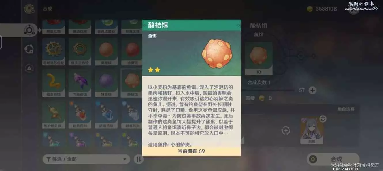 使用餌料:酸桔餌(材料:一個泡泡橘和一個小麥)