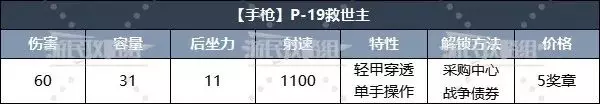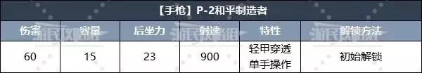 和平製造者是一把非常適合入門的副武器,傷害很高(與P-19救世主相同),但與救世主相比,它的後坐力較大,射速較低。只是初始比較好用,很容易被後續解鎖的兩把副武器替代。