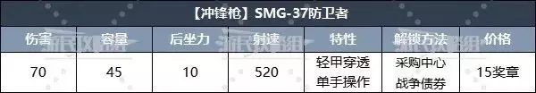 SMG-37防衛者比MP-98騎士更具操控性,不過從手感方面來講更適合作副武器而非主武器,它的後坐力更容易適應,晃動幅度也比較小。儘管它的射速較低,但彈藥消耗依然很快,所以需要搭配補給包。
