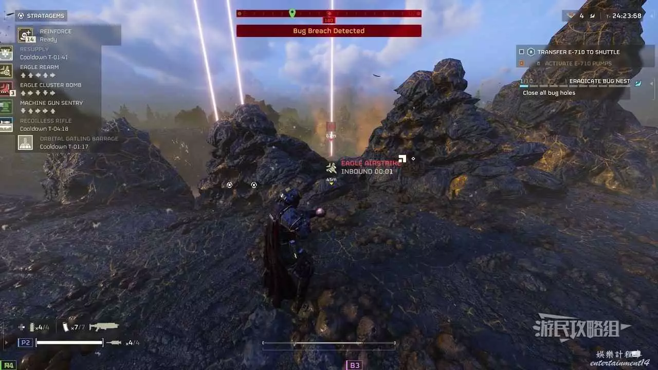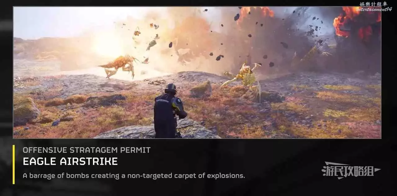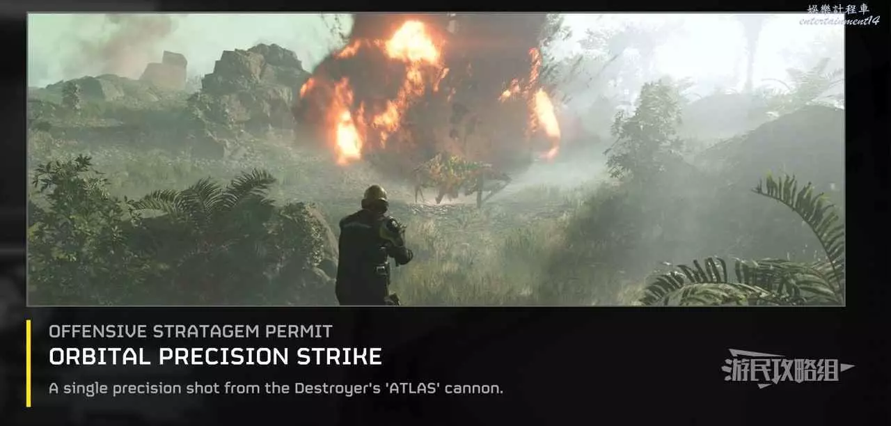這是開局解鎖的戰略配備,建議大多數任務期間都要攜帶,直到達到5級。適用於清除蟲洞,以及前期能遇到的一些難纏的敵人(例如衝鋒蟲),也能提供一定的幫助。體型較大的敵人可以用炸彈來解決,或者將軌道精準攻擊與消耗性反坦克武器搭配使用。除此之外,軌道精準攻擊的冷卻時間為100秒,因此在任意時長的行動期間基本都可以多次使用。