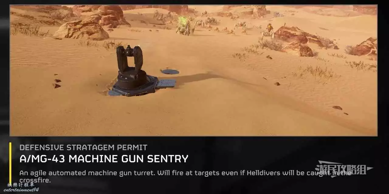 無論是單人還是多人合作,A/MG-43哨戒機槍都是非常便捷的戰略配備之一,尤其是前期需要快速升級時。A/MG-43哨戒機槍在2級時即可解鎖,短短3秒鐘內即可擁有一個能夠迅速移動並高速開火的炮台,來應對各個星球上密集的蟲群或機器人。當有多個敵人同時接近時,建議使用A/MG-43哨戒機槍來幫助完成火力壓制,在單人遊戲中可以防止被包圍,多人遊戲中可以增加火力。