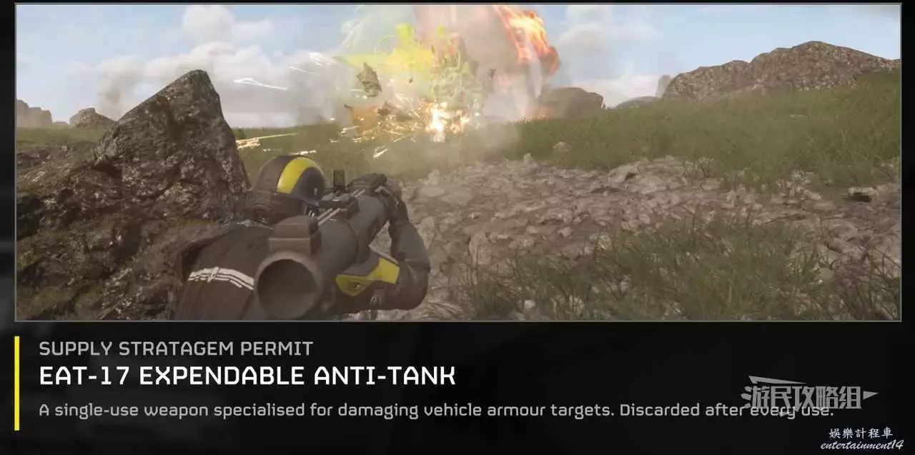 可以在3級時解鎖,執行中等及以上難度的行動時建議攜帶,在此難度的行動中有幾率會遇到衝鋒蟲,消耗性反坦克武器主要用來應對此類敵人。消耗性反坦克武器只能使用一次,用完即扔。每當玩家自己或隊友使用此戰略配備時,能夠得到兩把,所以可以同時使用打出兩發傷害,或者與隊友共用。
