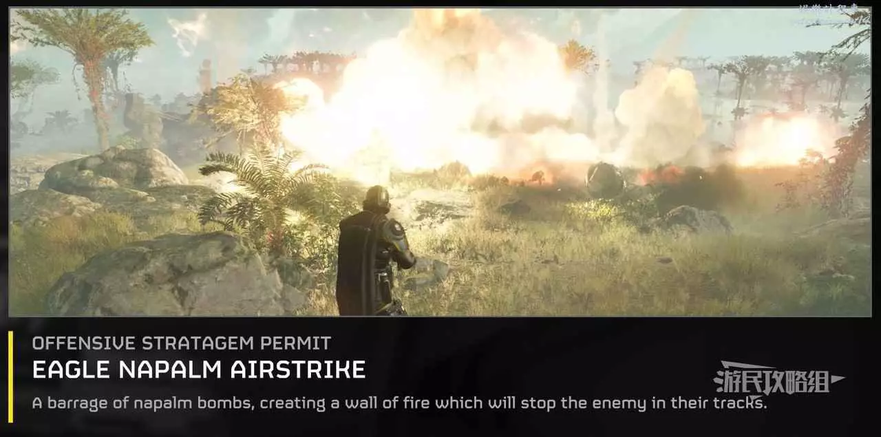 “飛鷹”凝固汽油彈空襲能夠造成大量傷害並持續摧毀目標,可以清除整個蟲巢,還能牽制敵人行動。5級時即可解鎖,使用次數為2次,但冷卻時間只有15 秒。不過適用的場景比較少,建議按需考慮解鎖。