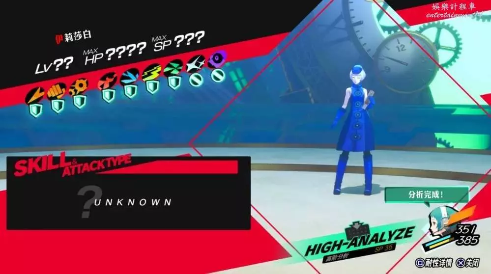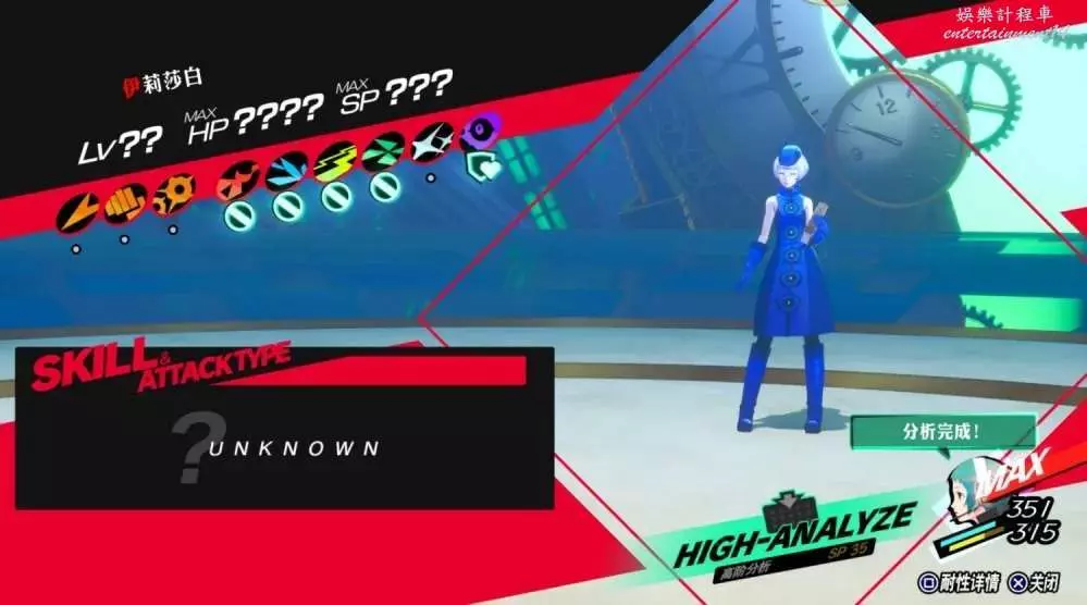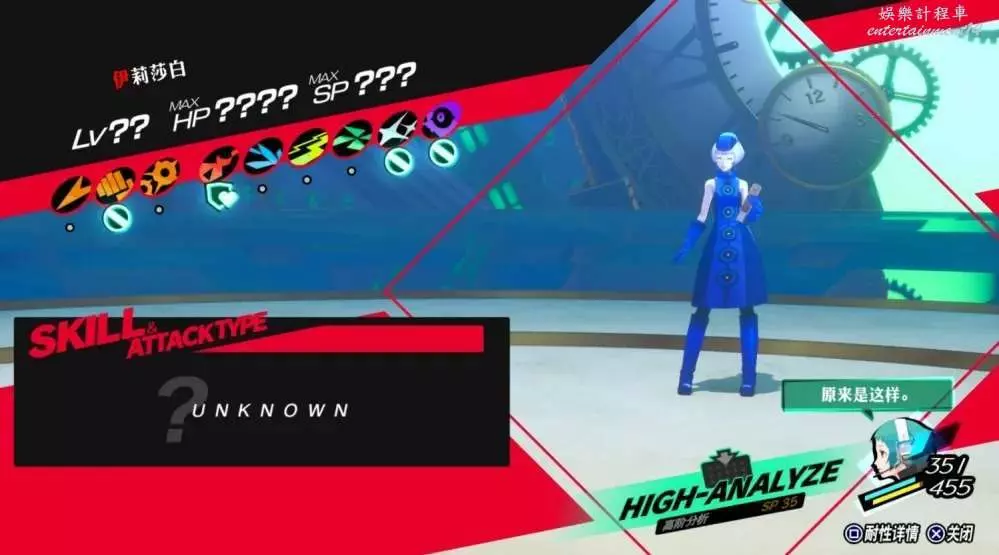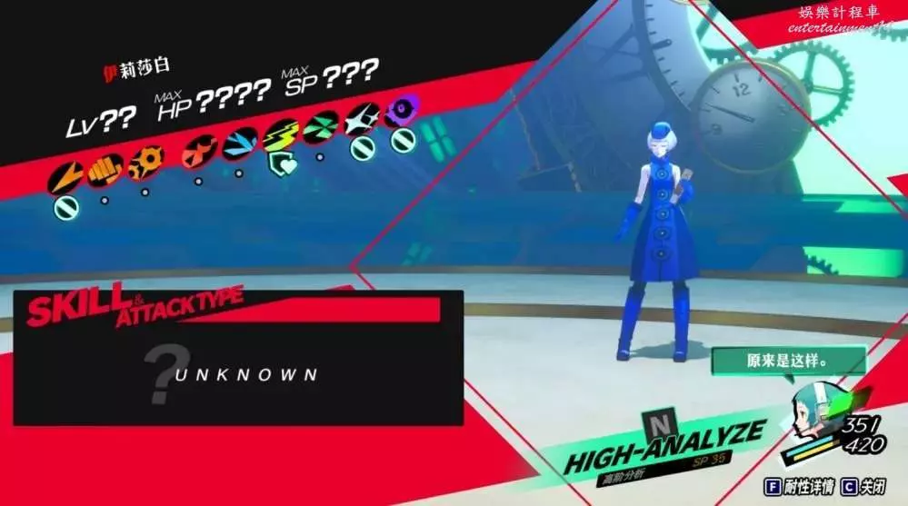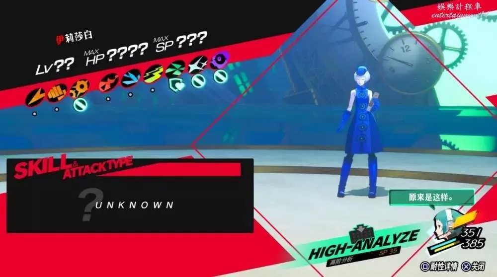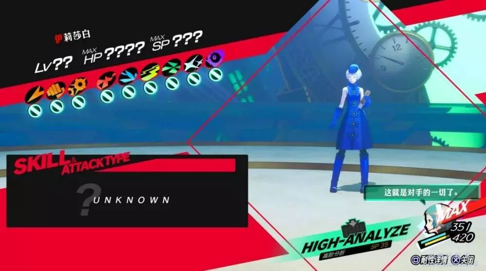 接下來是對伊莉莎白攻擊模式的解析。和P3P數值強橫力大磚飛的伊莉莎白相比,P3R的伊莉莎白作為隱藏boss更多的是在機制上較為強勢。伊莉莎白共20000血,一回合兩動,會使用9個不同的人格面具進行攻擊,且我方對當前回合伊莉莎白的攻擊不能是吸反無的抗性,否則伊莉莎白會追加第三動進行傷害9999的米吉朵拉翁攻擊,且之後的回合會進行全恢復+9999迴圈。
