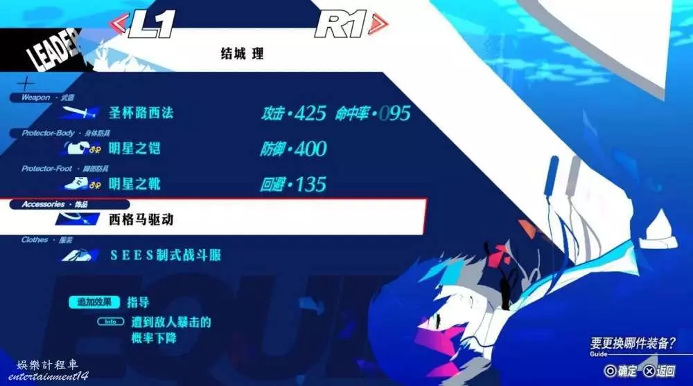 首先是武器裝備,選擇主角的最終武器聖盃路西法(審判 路西法受胎物)、最終防具明星之鎧、明星之靴(審判 彌賽亞受胎物);以上三件裝備均需要晦暗之月的亡骸和人格面具受胎物及寶石在古美術真宵堂合成,共需要金水晶10個、紅寶石20個、鑽石20個以及彌賽亞受胎物救世主的輝石兩個、路西法受胎物墮天使的斷翼一個。飾品選擇西格瑪驅動來減少暴擊幾率。