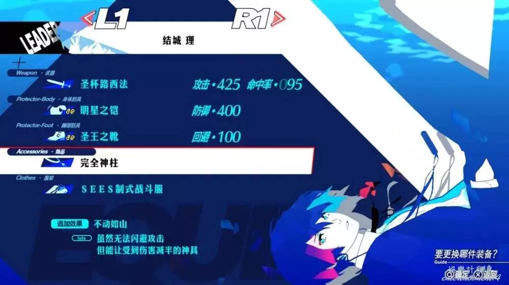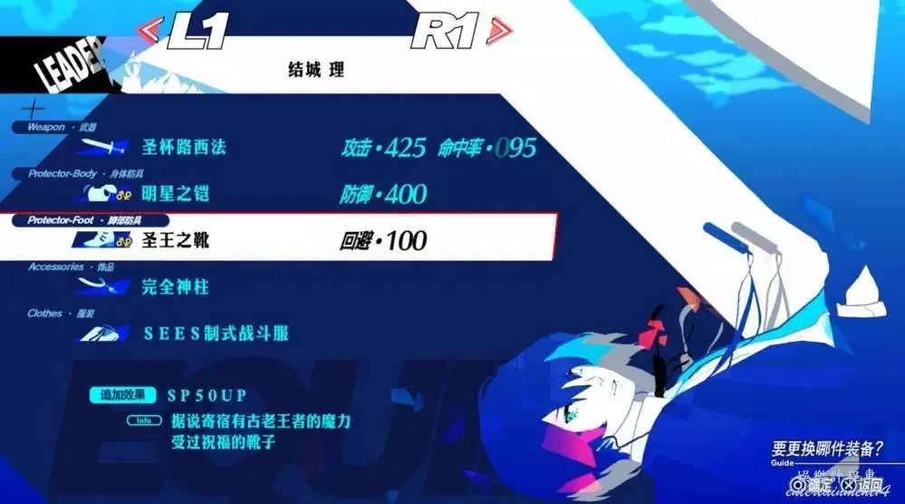 由於完全神柱的效果為敵方技能必中,所以捨棄了明星之靴改為聖王之靴加了50sp,沒有聖王之靴也可以按照自己的需求去換成有其它被動的鞋。