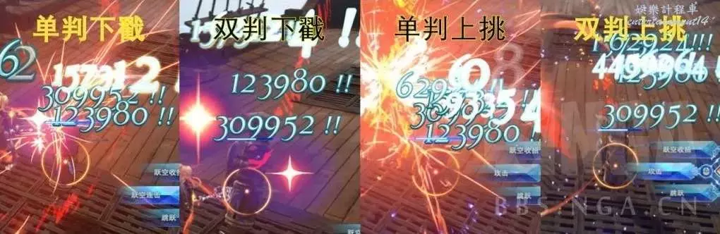 回到追擊雙判,由於上挑昏厥值加的非常少所以測量可能有誤,但我個人姑且是得出了一個結論:雙判與單判下戳無區別,上挑傷害和昏厥值增加。以下是對比圖:
