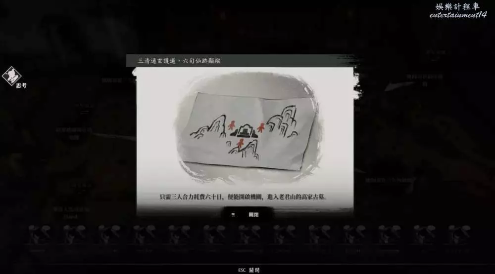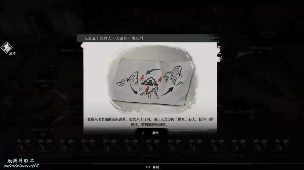 推論3:集齊【進入古墓之法與奇功及大盜無關】、【以倒序啟動三座山頭的機關】、【機關需在六旬內解開】、【機關需要三人解開】可得出推論【大道五十衍四九,人逆其一開天門】。