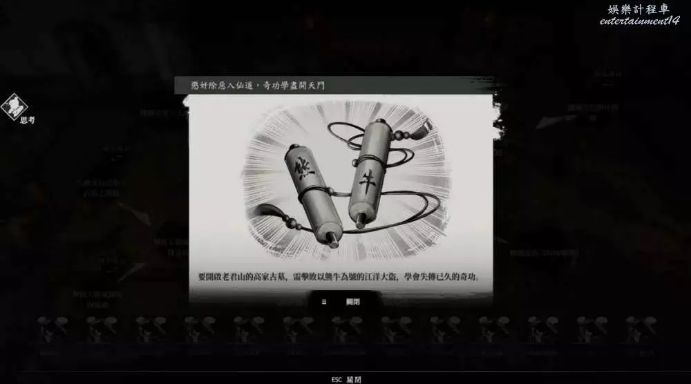 推論2:集齊【擊敗大盜或能取得奇功】、【以倒序啟動三座山頭的機關】(此處選擇依序或倒序啟動不影響推論結果)、【機關需在六旬內解開】、【機關需要三人解開】可得出推論【懲奸除惡入仙道,奇功學盡開天門】。