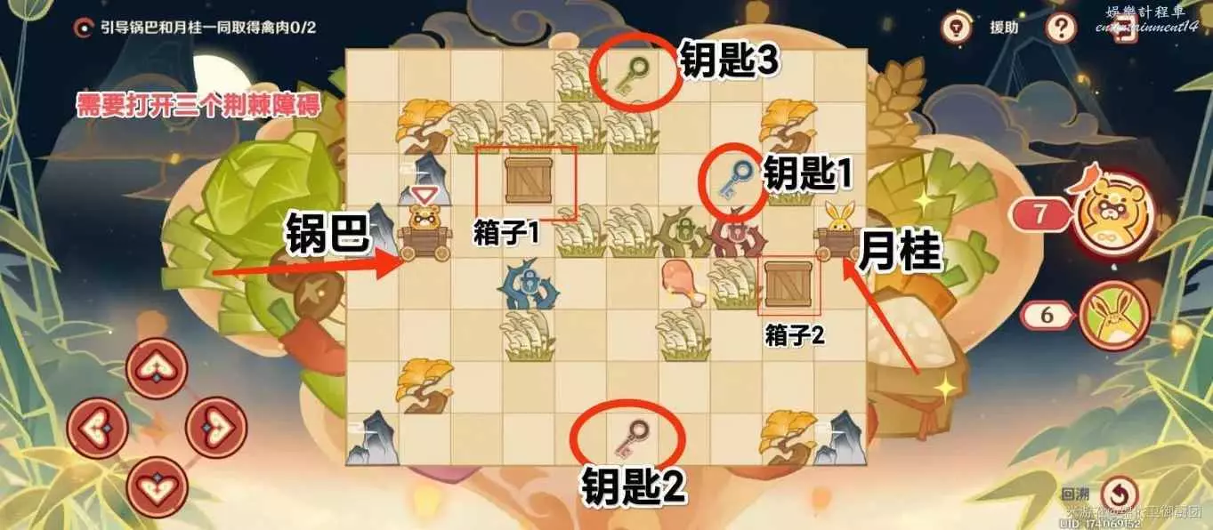 開局如圖:月桂、鍋巴、三個鑰匙、兩個箱子
