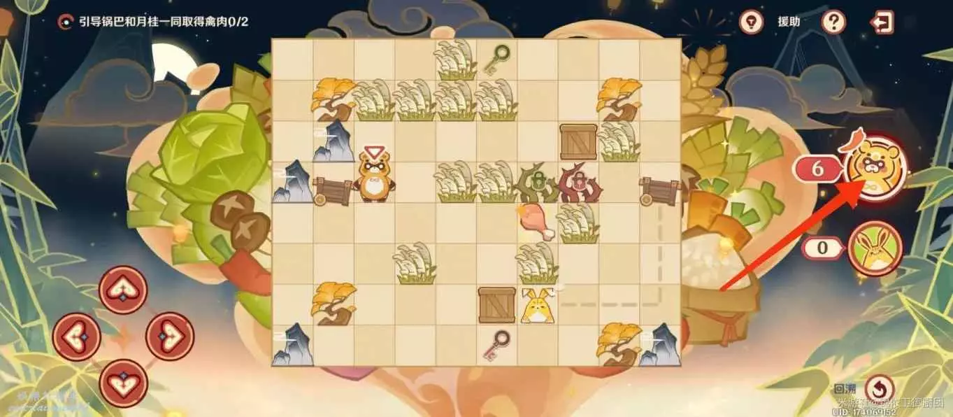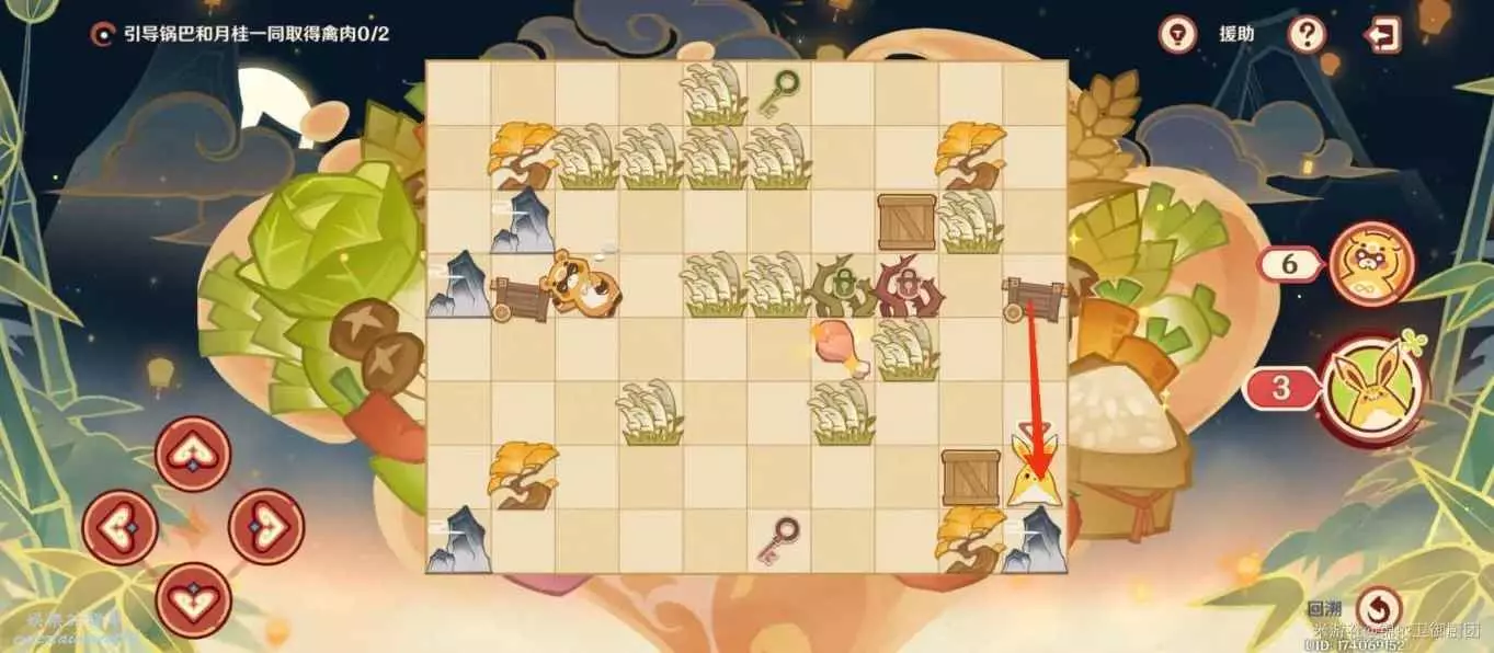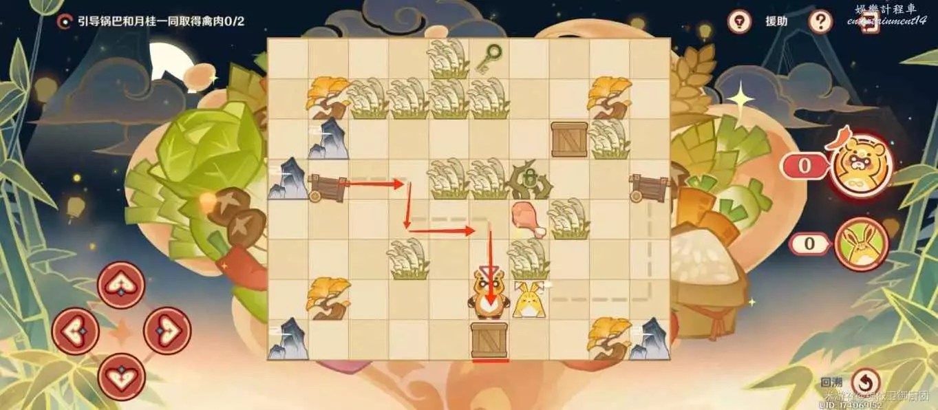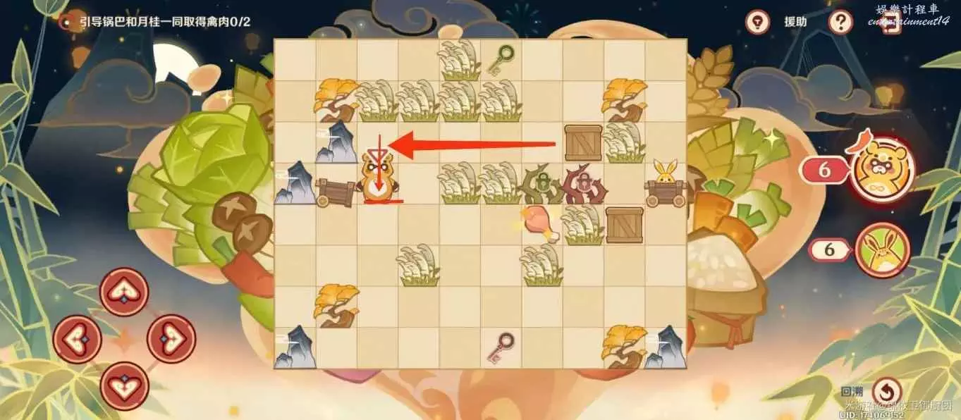 首先移動鍋巴,先向右移動一格,再向上移動一格〔按照下圖箭頭方向移動〕