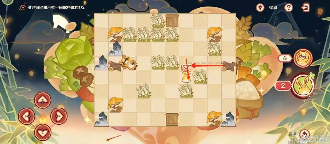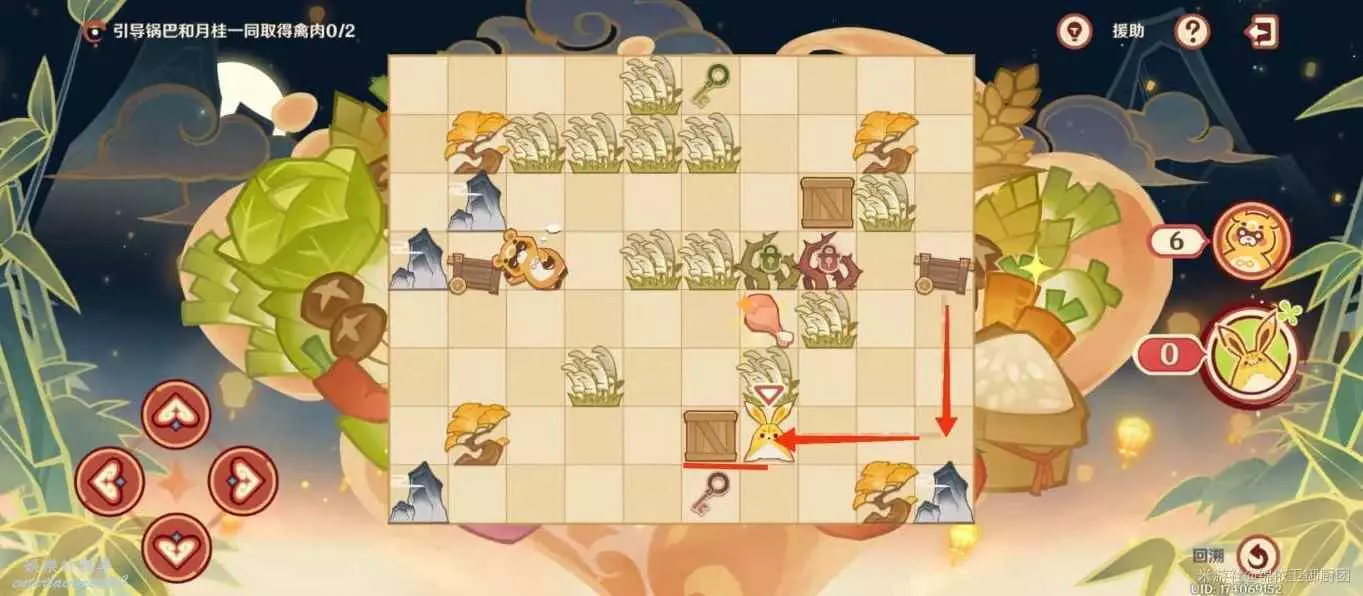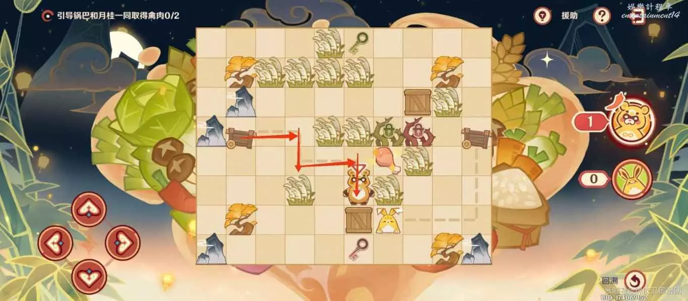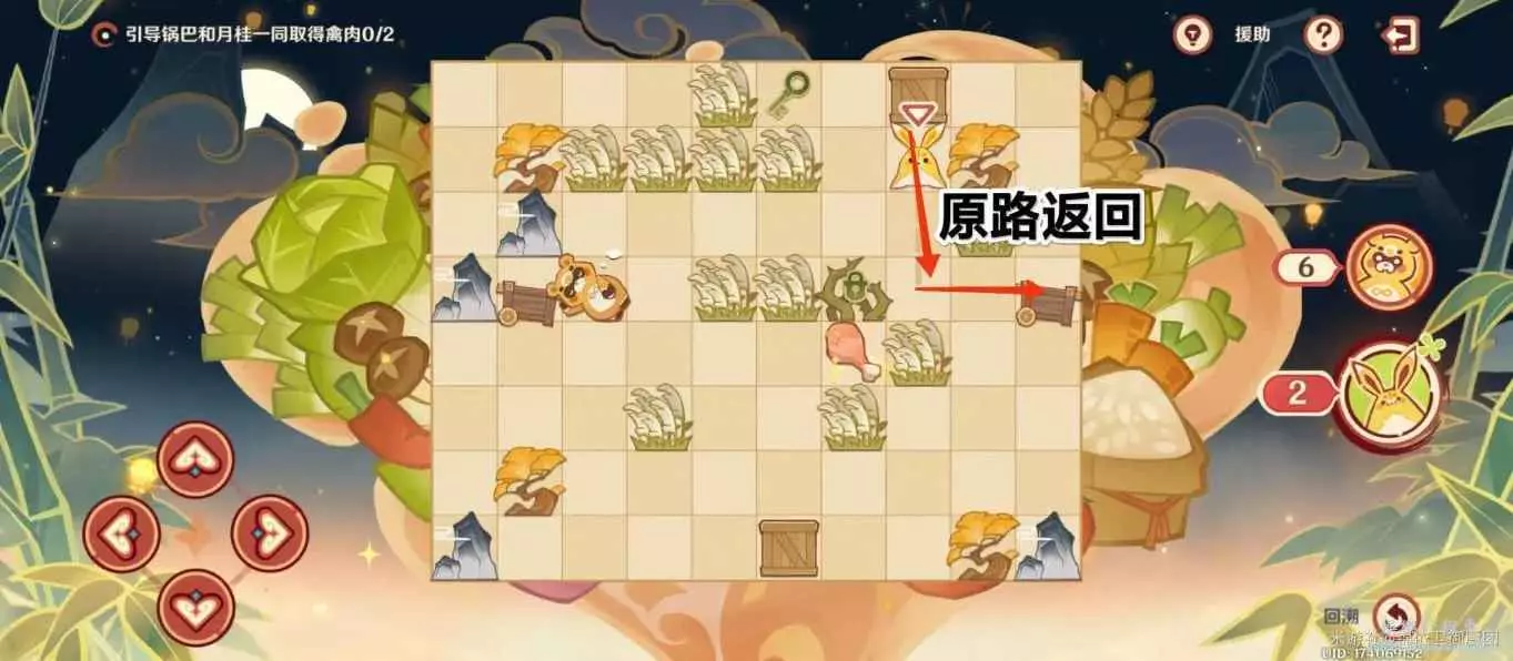 返回後月桂向左移動三格,再向下移動一格,即可到達食物的位置