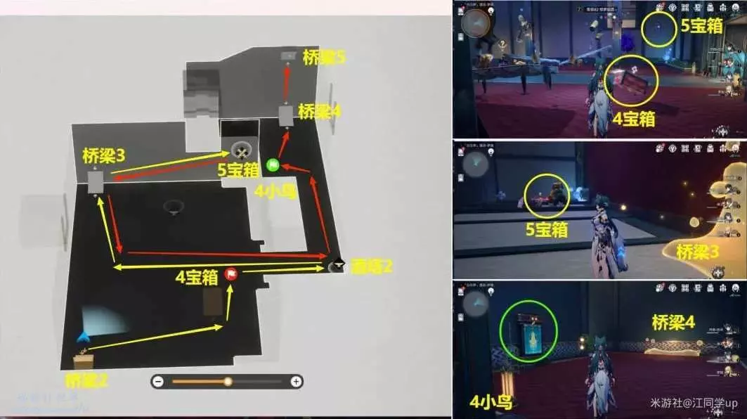 (2)從【橋樑2】上來後,拿了【4寶箱】,去【酒塔2】獲取次數後,從【橋樑3】上去,上面右邊是【5寶箱】,然後返回【酒塔2】獲取次數後,去拿【4小鳥】,接著從【橋樑4】上去後,繼續從【橋樑5】上去