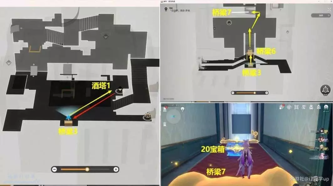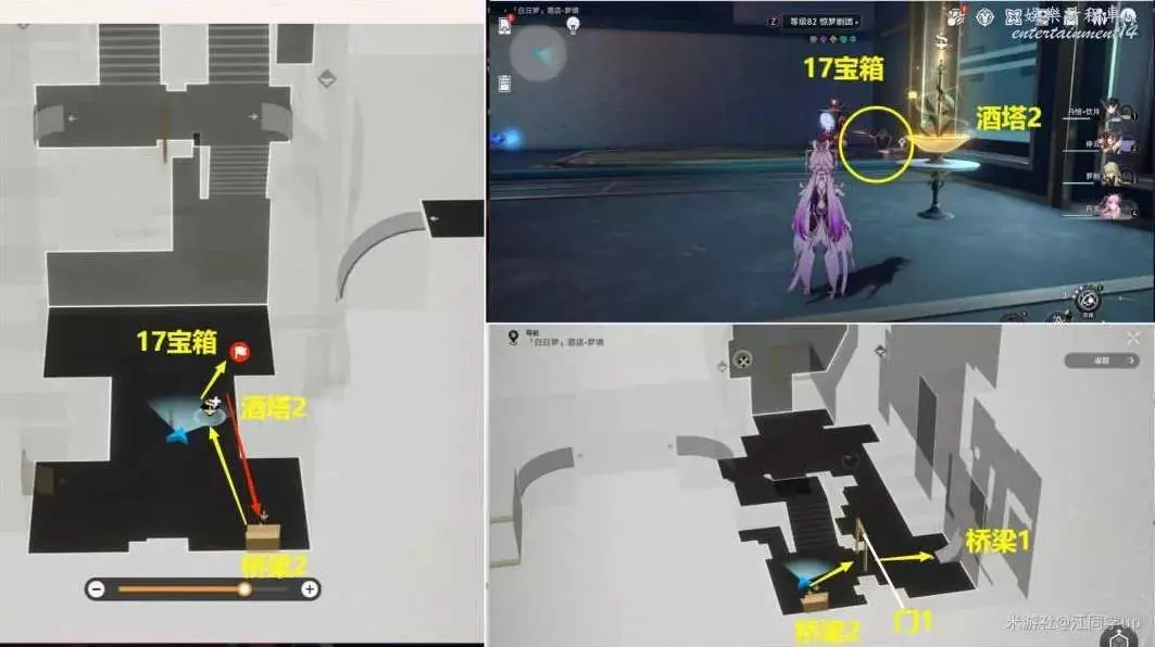 (1)進入【房間1】後,去【酒塔1】獲取次數,從【橋樑1】上去後,繼續從【橋樑2】上去