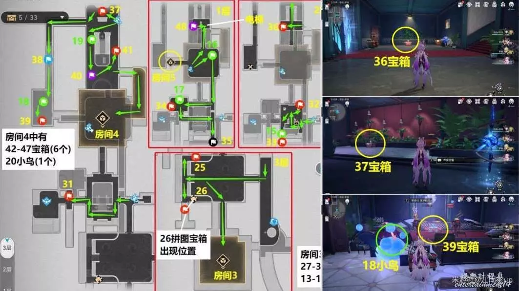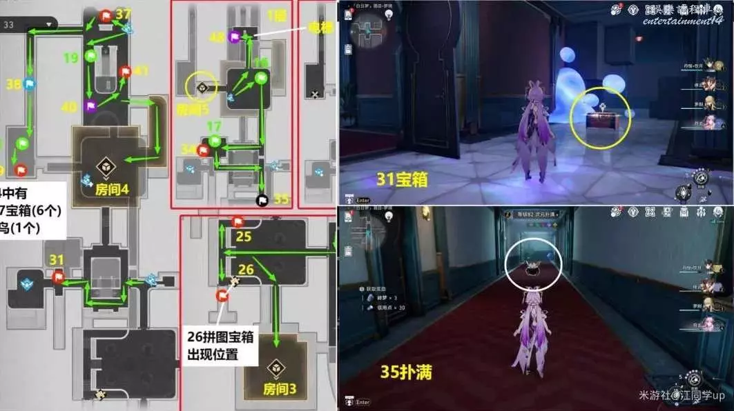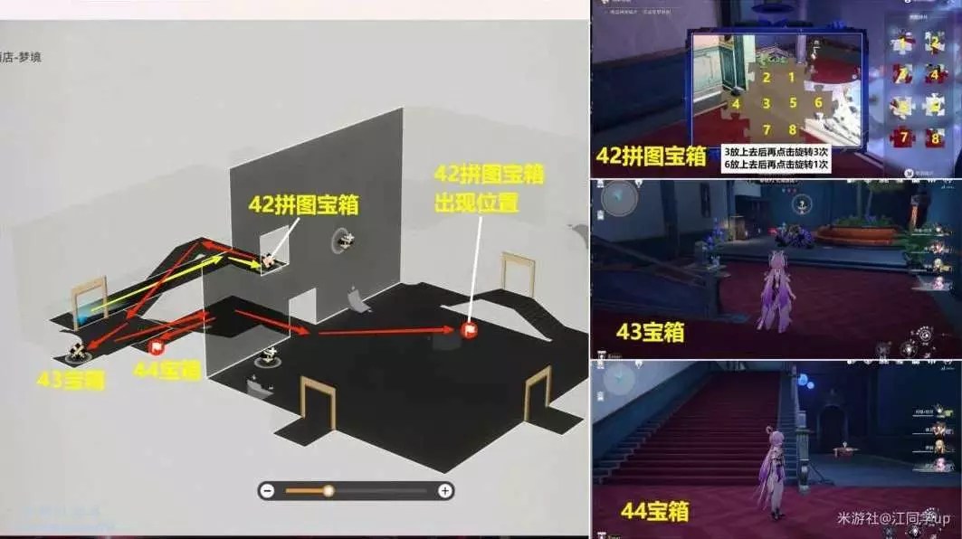 (1)進入【房間4】後,去完成【42拼圖寶箱】,【42拼圖寶箱】會出現在下面大廳中,路上可以拿了【43寶箱】和【44寶箱】