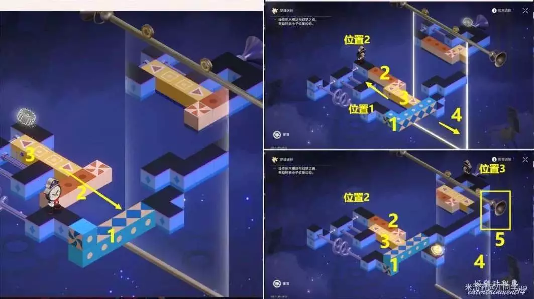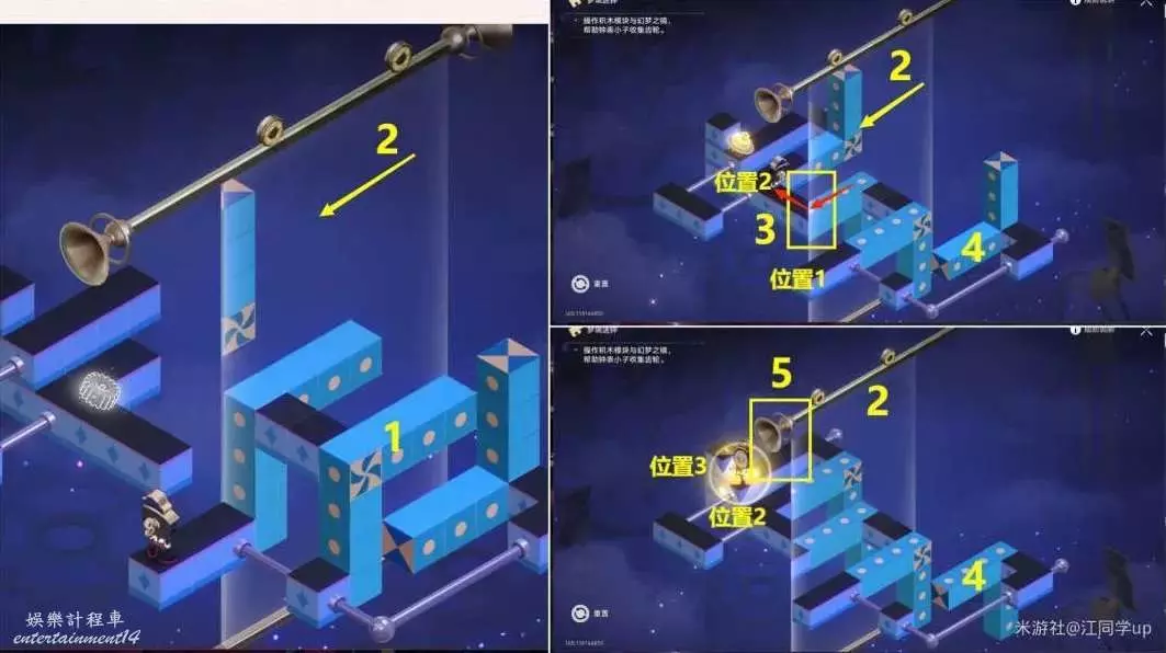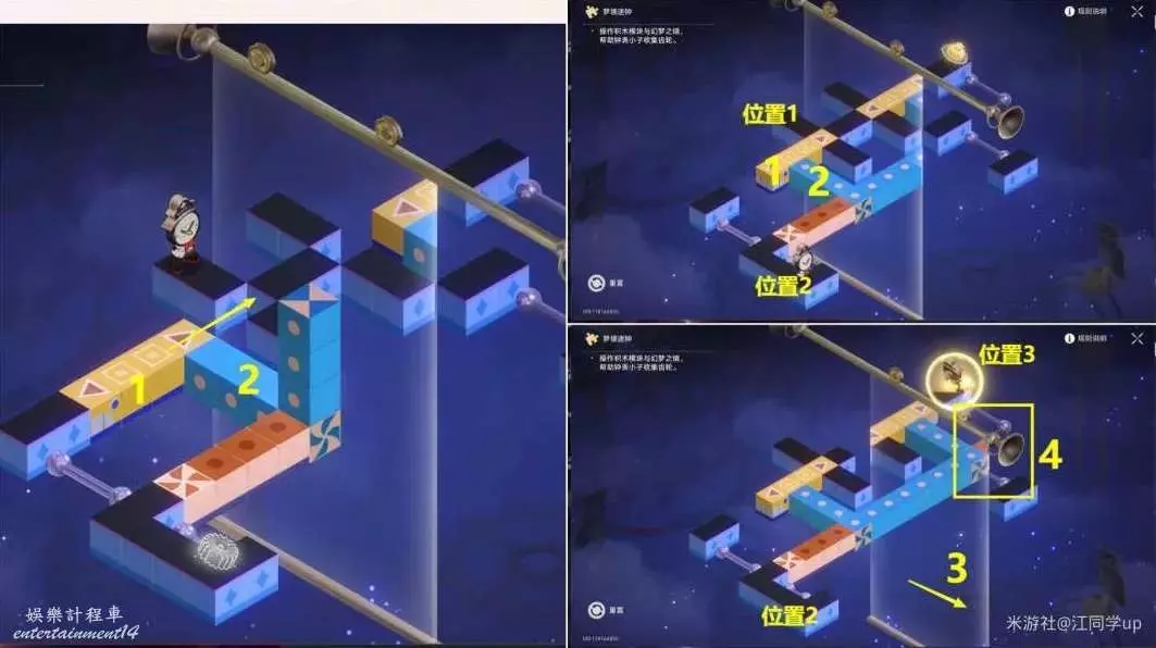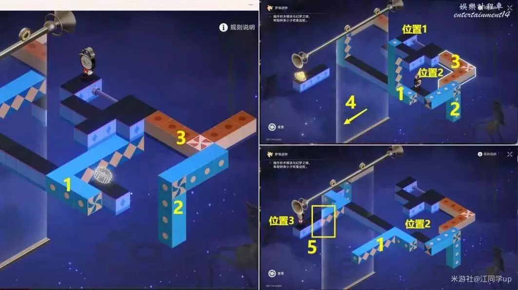 (2)將1藍色模組點擊旋轉1次,將4鏡子往左下移動,使5位置拼接到一塊,【鐘錶小子】會從位置2到位置3,解密完成