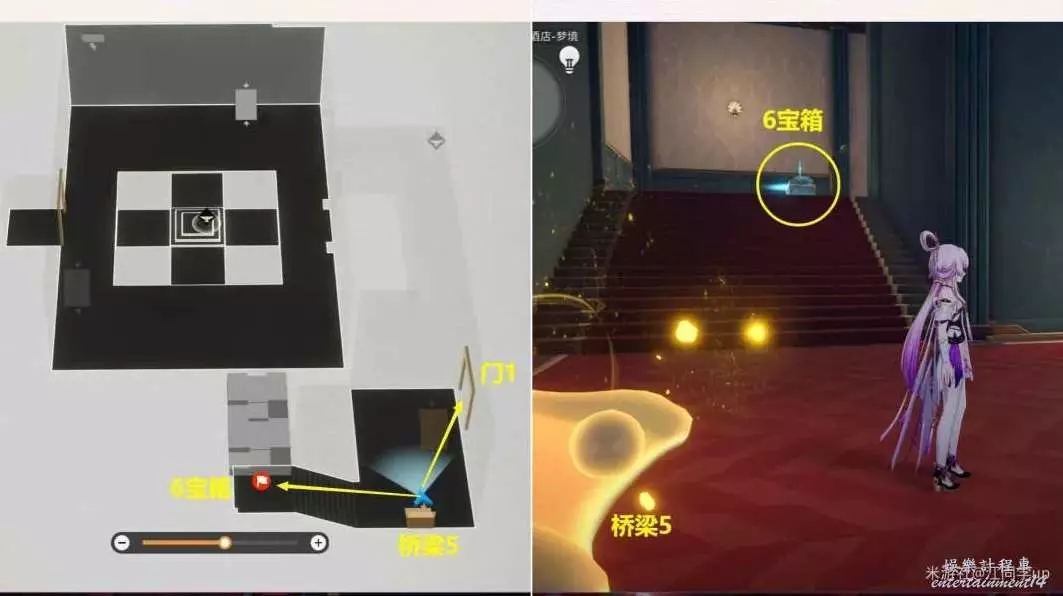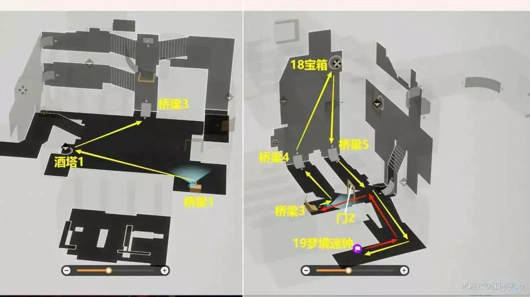 (13)從【橋樑3】上來後,從左邊【橋樑4】上去拿了【18寶箱】後,接著從【橋樑5】下去,就可以到達19【夢境迷鐘】位置完成解密,然後打開【門2】再從【橋樑3】下去