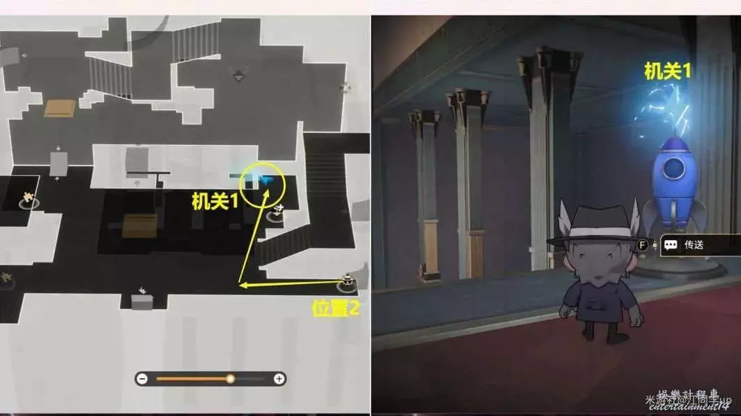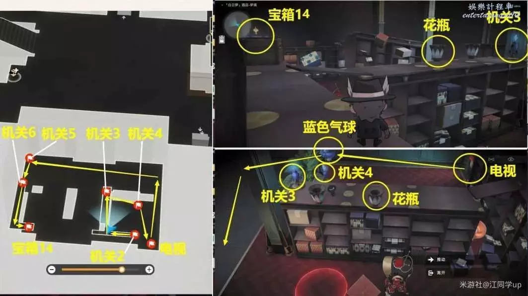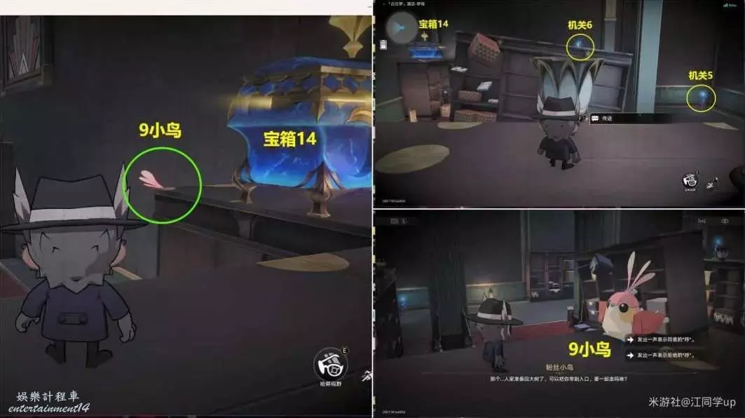 (1)變身後,先從身後【機關1】去上面【機關2】,在從【機關2】去拿了【32寶箱】,然後故意讓【敵人】發現,將我們傳送初始位置,然後再從下面的洞口進去拿【33寶箱】,洞口是【15小鳥】,需要連續【拽】3次才會出來