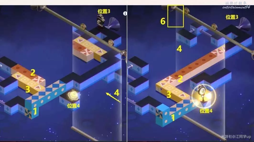 3)將1藍色模組點擊旋轉2次,將2橙色模組點擊旋轉1次,將3黃色模組移到右下,將4鏡子往左上移動到滑竿頂端6位置,【鐘錶小子】會從位置3到位置4,解密完成