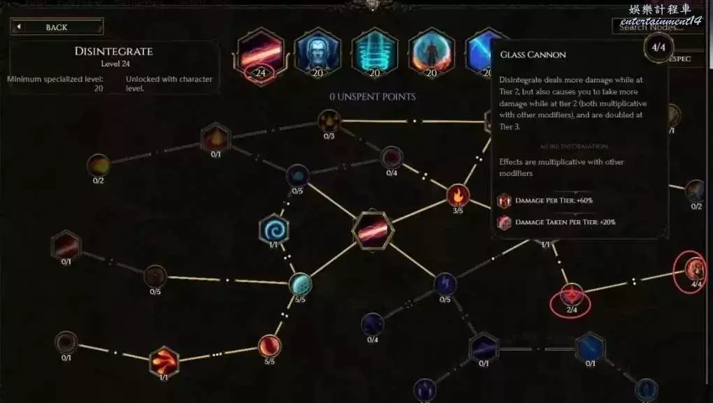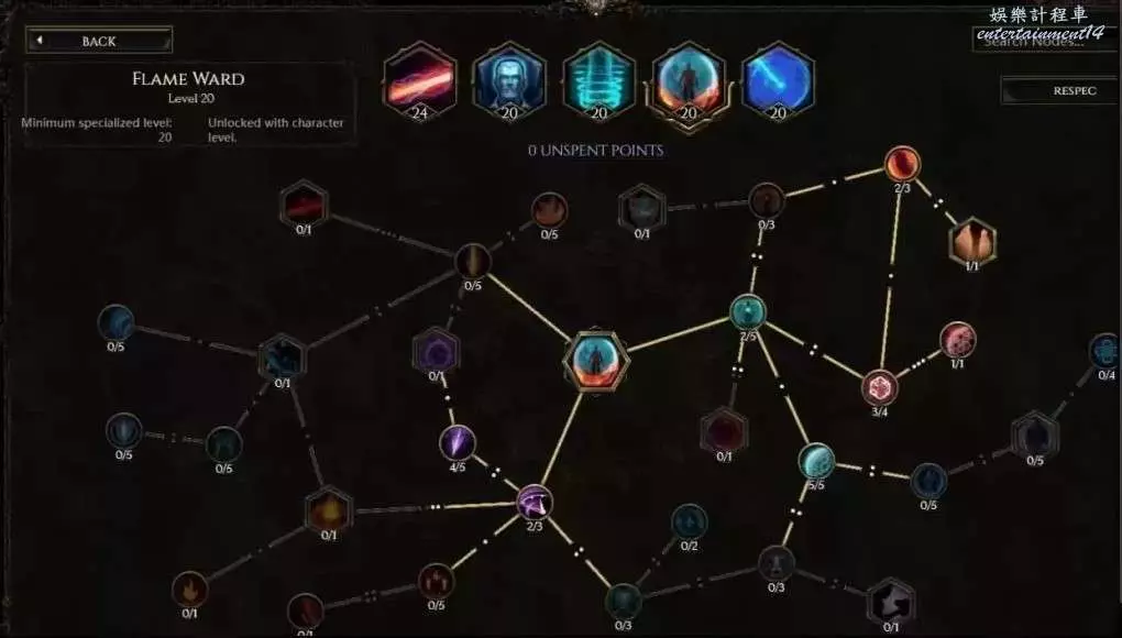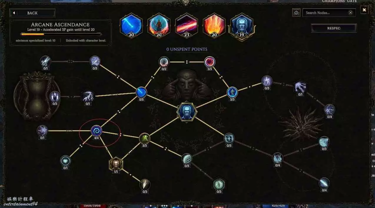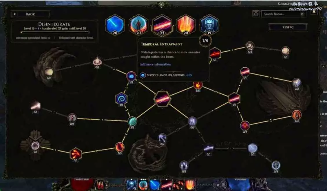 射線-前期不點左下角雙射線,魔力多了再點,不然過圖藍耗吃力。前文所述,射線選擇加電轉火,因為可以全吃到火焰護盾的250%火焰傷害inc,後期射線的加射程也可以不浪費點(如果轉全電射線,那相應的整體需要技能點較多),前期缺少遺物的2點技能可以先把Intensify烈度的點摳掉一些以優先滿足more增傷的點。後期生存起來可以點出右邊那點增加more傷害和增加受到傷害(危)的點(T6射線技能詞綴即可達成,如只有T5,減傷可以挪一點),