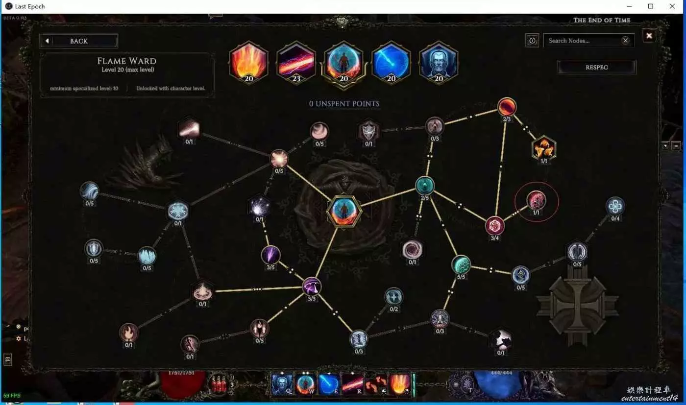 火焰護盾-增傷和輸出的主要來源,手動激發產生大量護盾,持續期間250%火傷inc(後期找生存為了加減傷加不出250%只能到150%),30%本體減傷,40%擊中傷害減少(綜合減傷58%),關鍵要注意的是必須點出火盾不再反擊的點,因為反擊會造成暴擊打斷核心裝備賦予射線的1000+增傷(0.90因為快照機制所以火盾在射線持續期間就算造成暴擊也不影響射線輸出,可扣出3點補滿250%的inc提高或者火點傷,未測試如有影響就按圖加)。