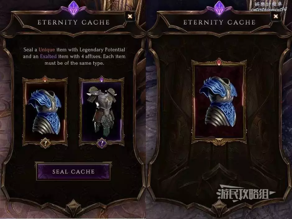 從【神聖紀元】(需要時空轉移)打開永恆寶箱,將具有傳奇潛能的暗金裝備和帶有4個詞綴的紫裝放進寶箱,點擊【封印寶箱】。然後切換到【廢墟紀元】,打開永恆寶箱,即可獲得傳奇裝備。