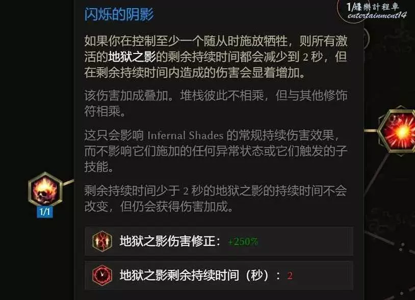 也就說,在有召喚物的時候釋放犧牲,已經啟動的所有地獄幽影都會疊加一個250%more,這是一個可以疊加的增傷,如果釋放了3次,那麼就是750%more增傷,在高施法速度下,10s內最少3000%more(對同一個目標重新釋放地獄幽影會丟失對該目標的之前所有疊加)。