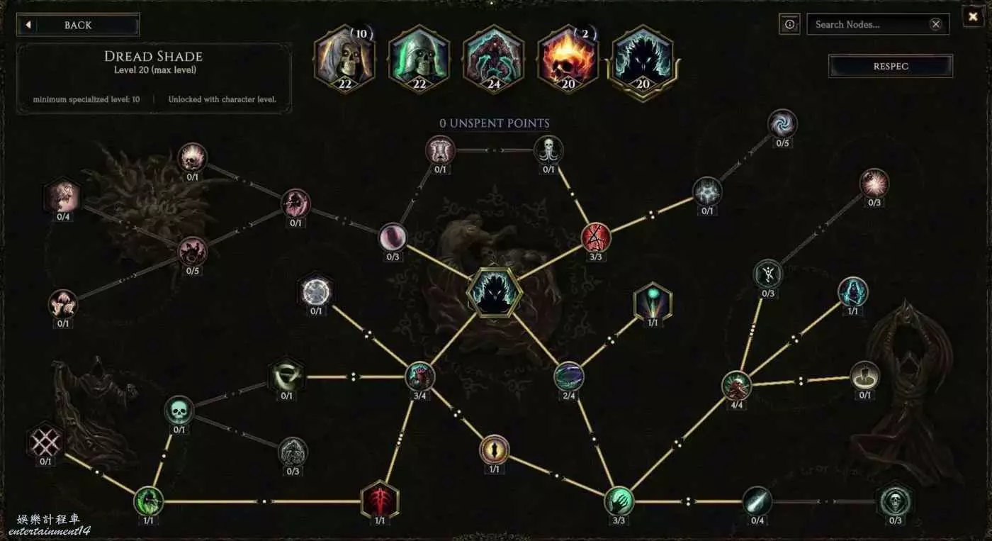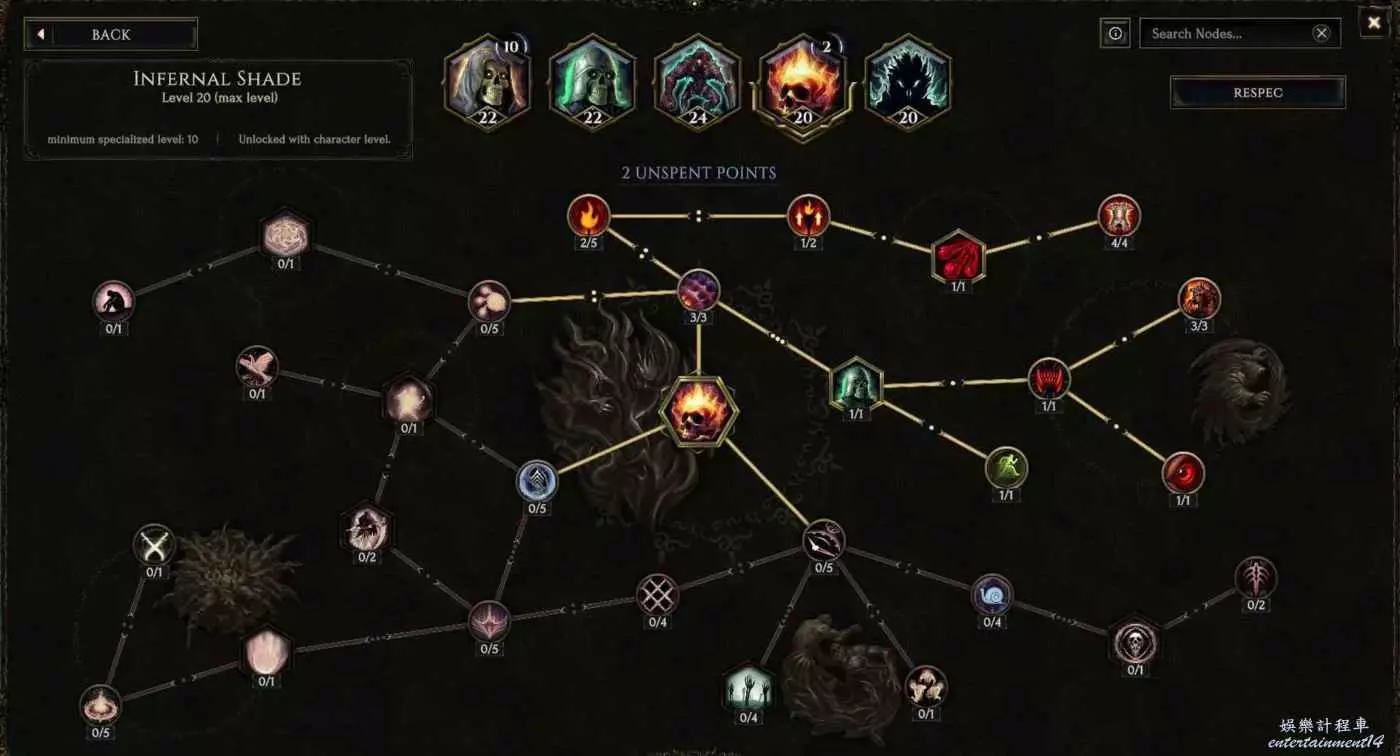 如圖所示只需18點加點即可,目的是召喚物常駐急速狀態(30%移速)和72%召喚物攻速和移速,右上角破甲柳勝於無(也可不點,剛需只要10個專精點)。