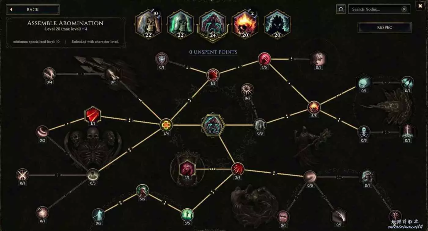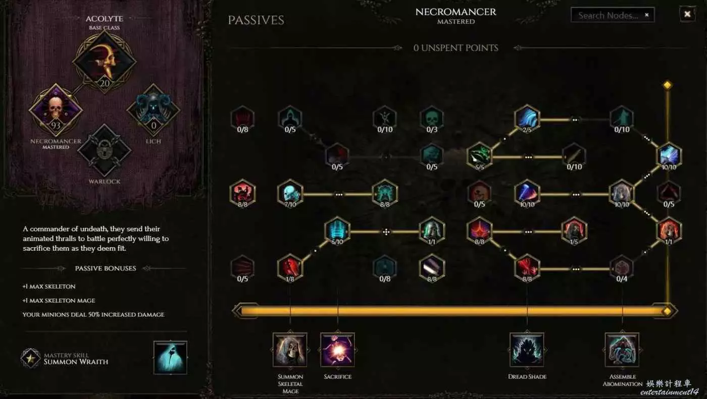 直傷召喚流沒太多特定的機制,主要就是利用縫合怪天賦樹,獻祭骷髏種類和個數來達到增傷。因為縫合怪自帶攻速收益降低,且人物職業天賦和雙影帶大量攻速,選擇放棄左下角攻速天賦全部堆傷害(實測傷害天賦比攻速天賦多20%輸出)。