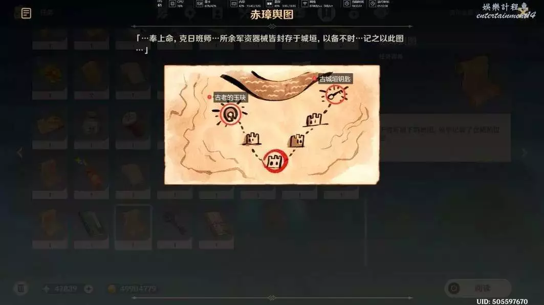 拾取寶箱後,我們得到「赤璋輿圖」和「古城垣鑰匙」