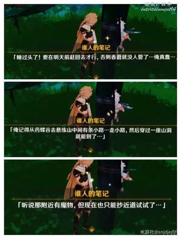 筆記內容得知香莙爺爺被魔物攻擊受傷仍前往懸練山找仙水
