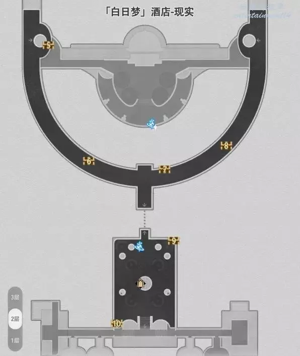 寶箱在2層西北方向的電梯間後面,拿完4號寶箱後直接坐電梯上去2層即可快速來到點位5。
