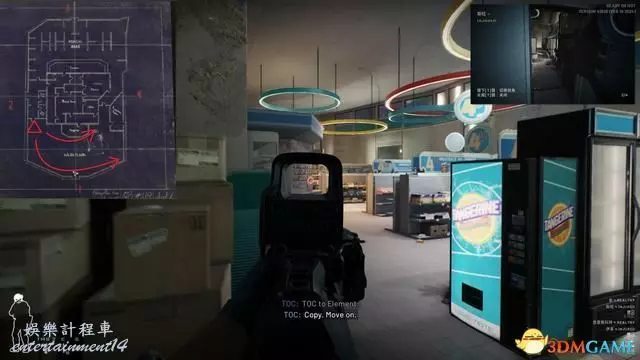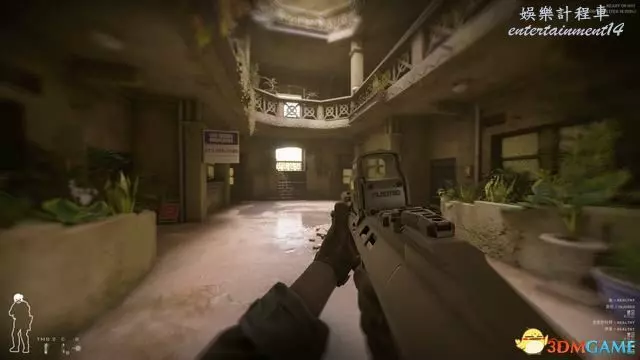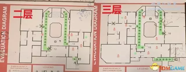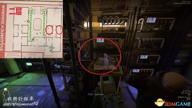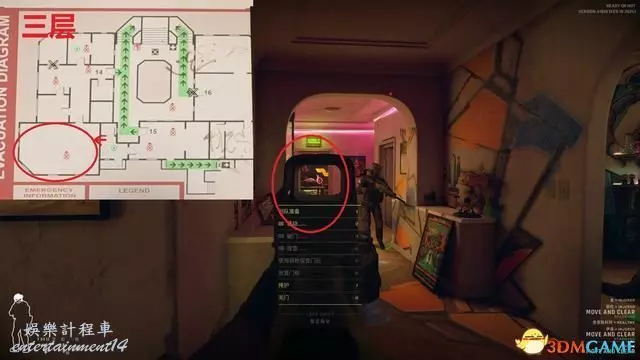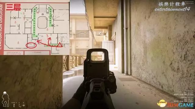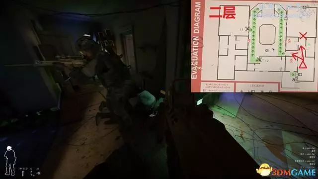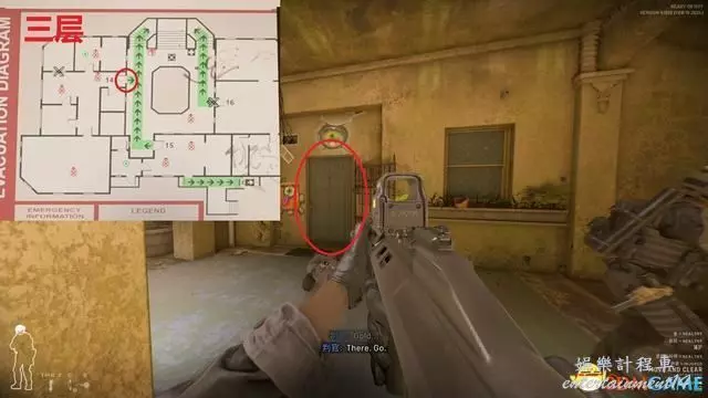 進入關卡後優先從下圖位置沿安全樓梯往上,中庭非常容易受到樓上敵人夾擊。