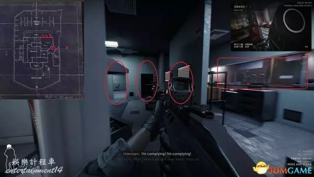 利用C2破門後丟閃壓制,優先處理下圖標記的房間。