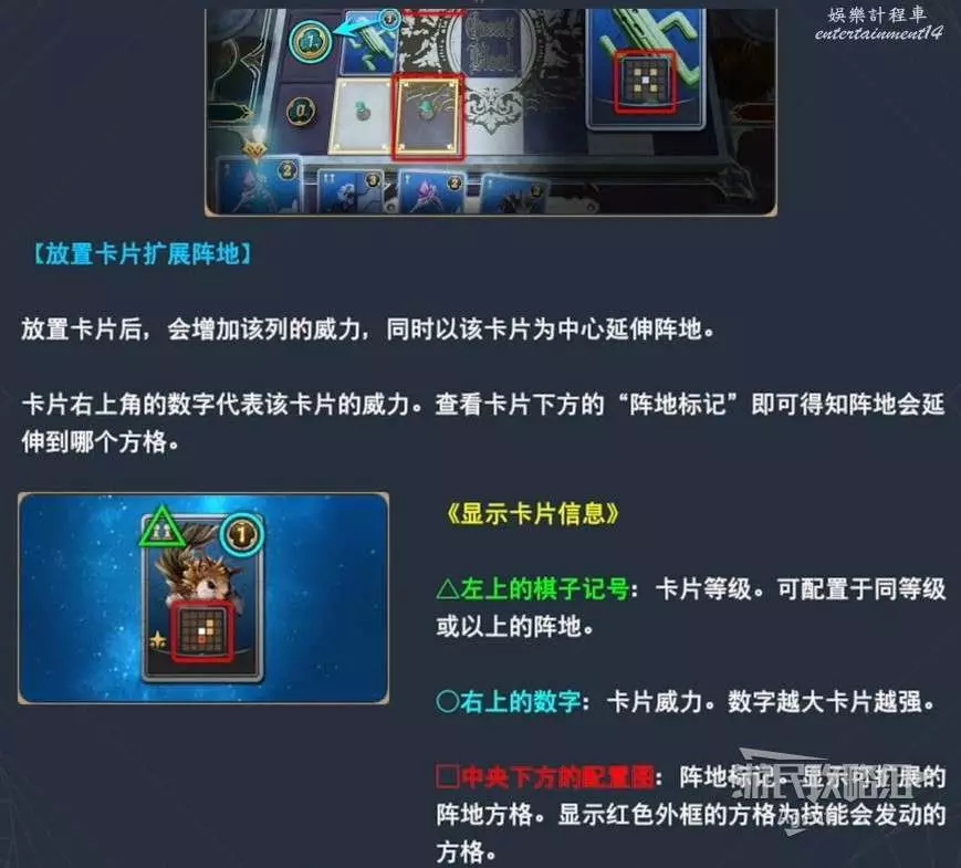 卡片下方是陣地標記(下圖紅色框),代表這張卡片放到棋盤上後,可以佔領的地盤範圍。白色方塊代表卡片本身所處位置,黃色方塊代表占地範圍,紅色方塊代表卡片技能起效果的區域。