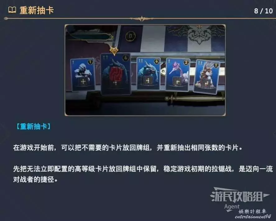 在牌局開始前,可選擇不需要的卡片放回重抽。等級較高的卡片一開始是無法放上棋盤的,所以建議先退回重抽,留到後面作為殺手鐧。