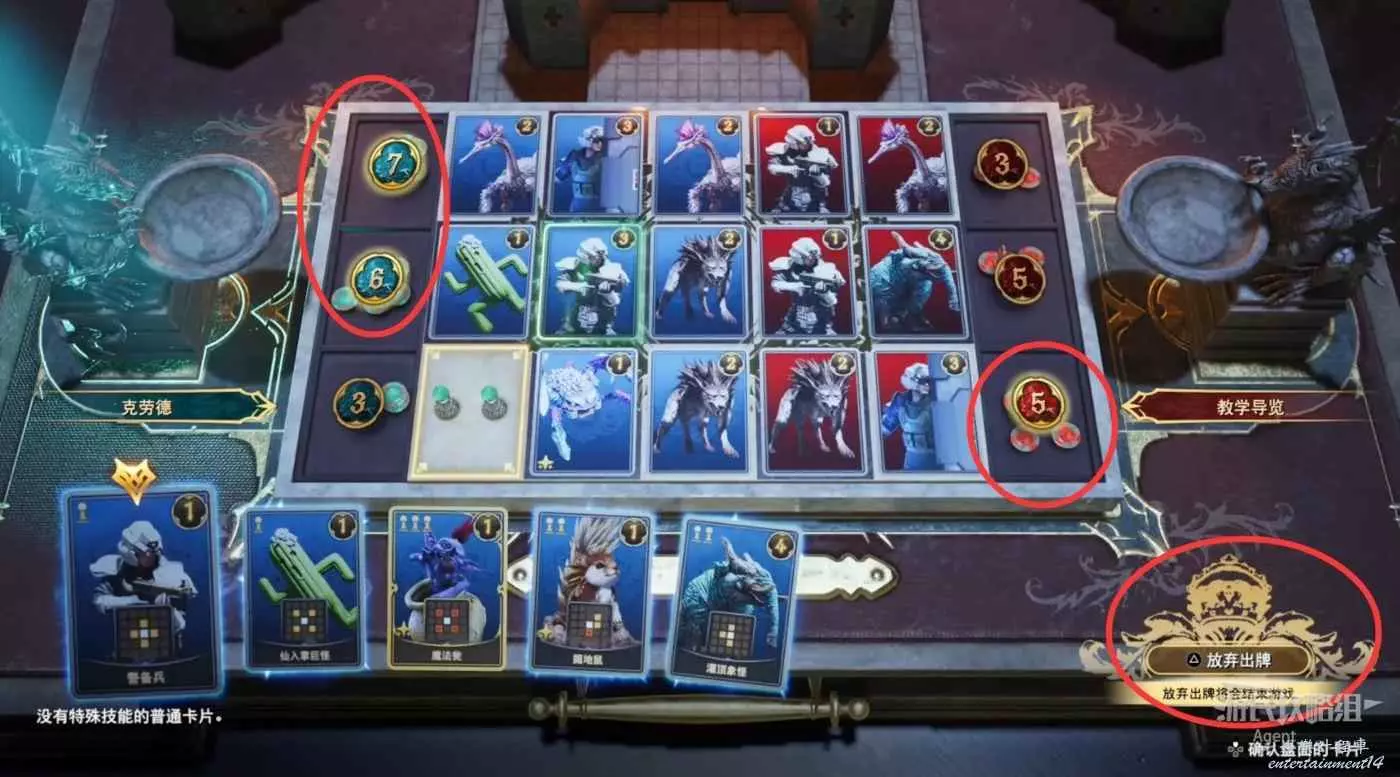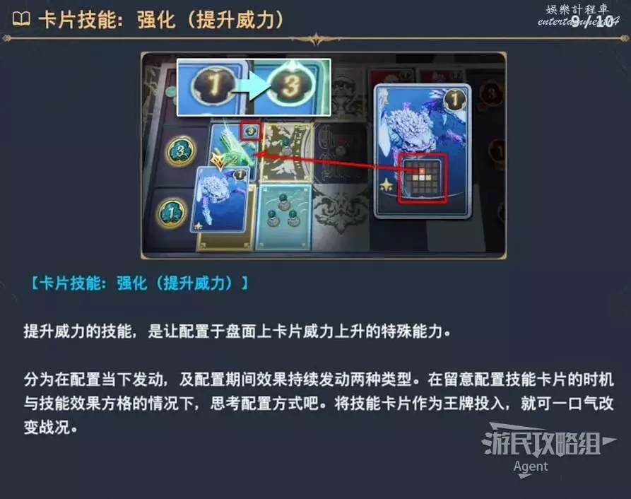注意有些卡片具有卡片技能,可以提升或者降低、我方或者對手的卡片威力。紅色方塊代表卡片技能起效果的區域。