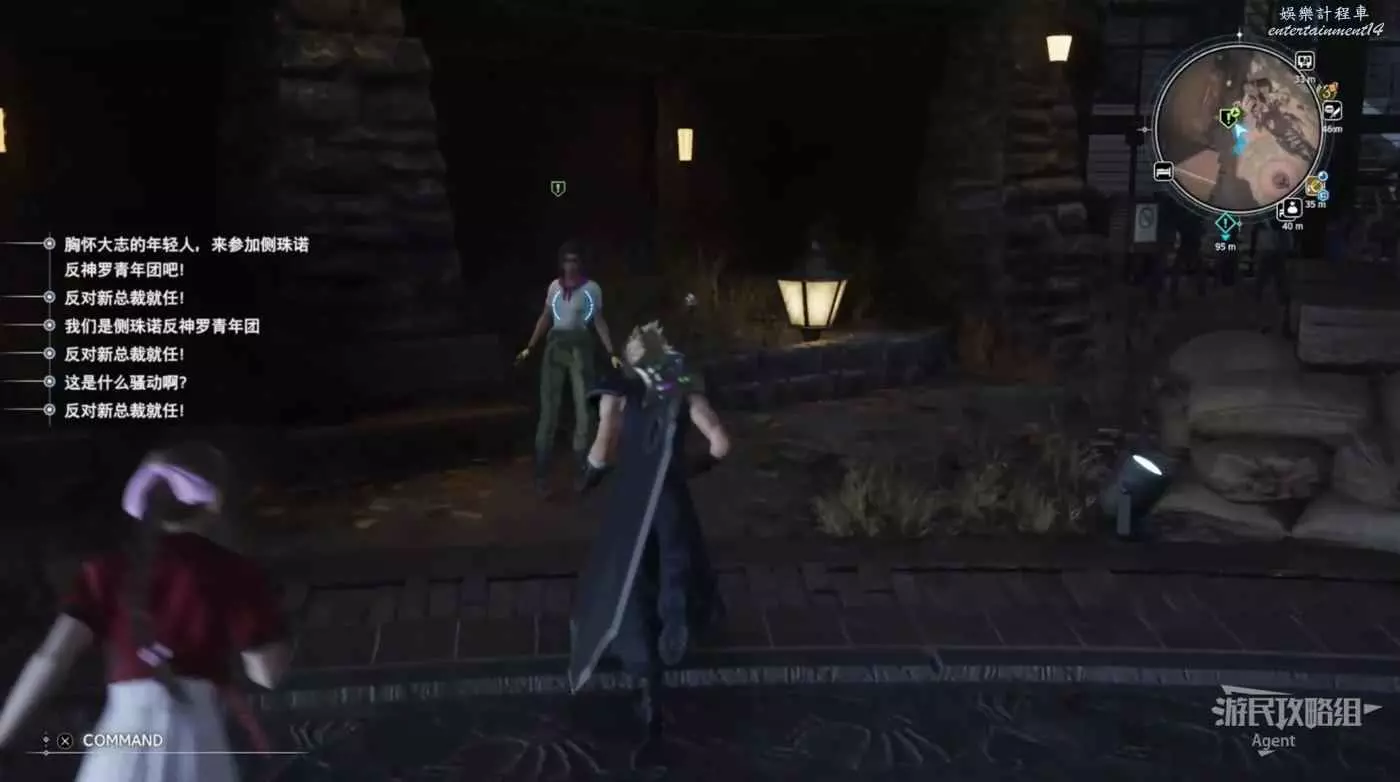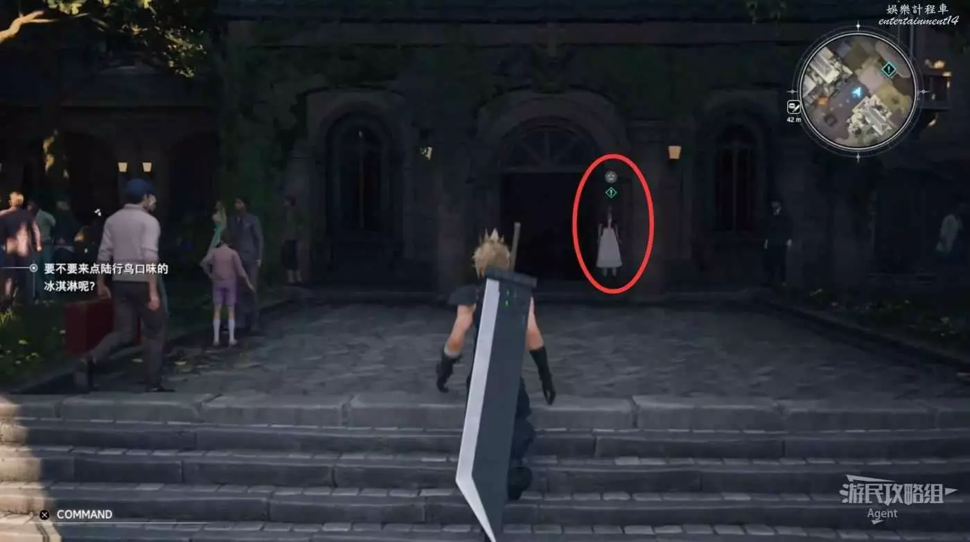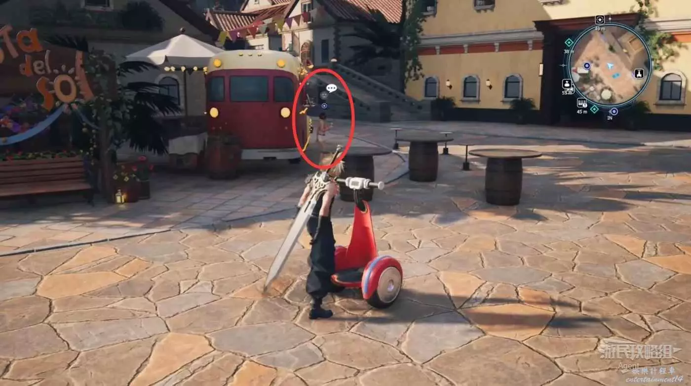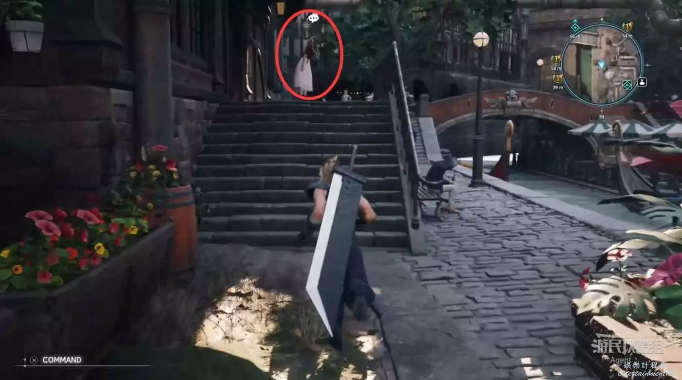酒吧門外廣場上見到蒂法,她背後的塔很像克勞德和蒂法小時候約會的地方。
