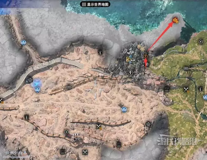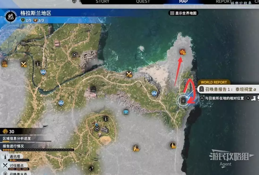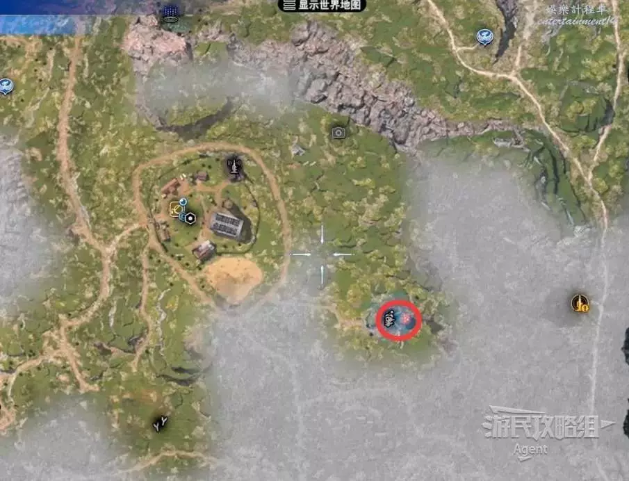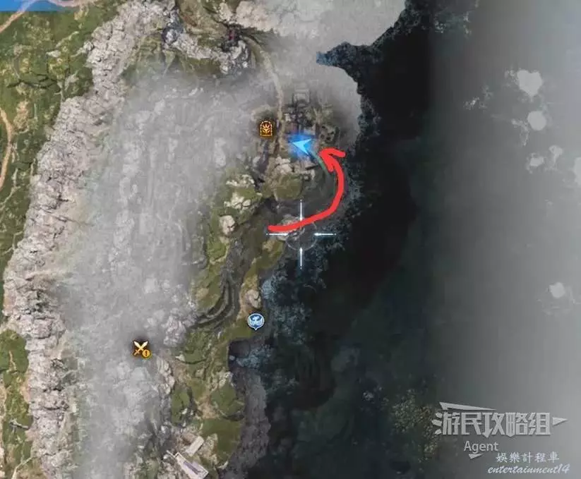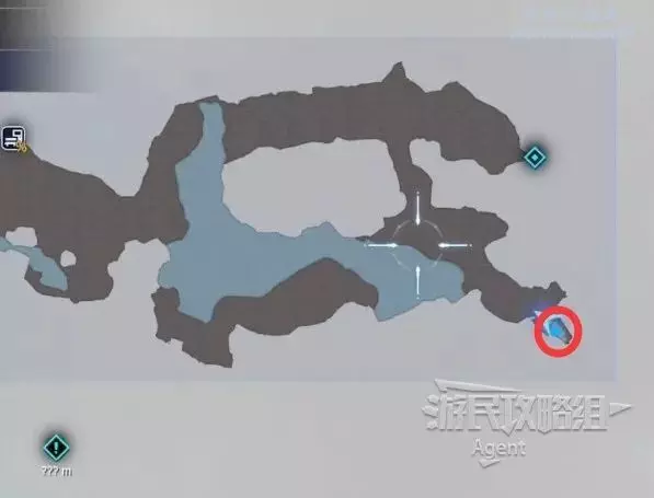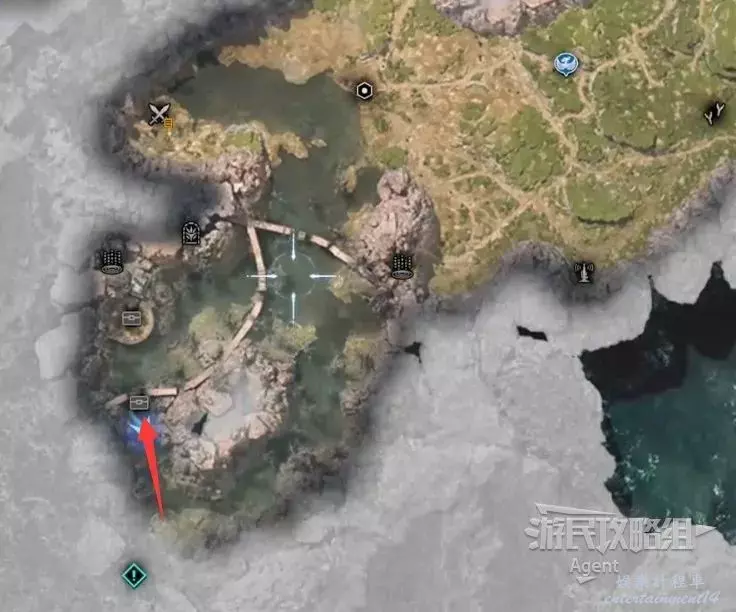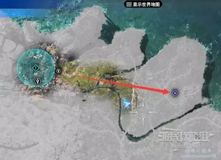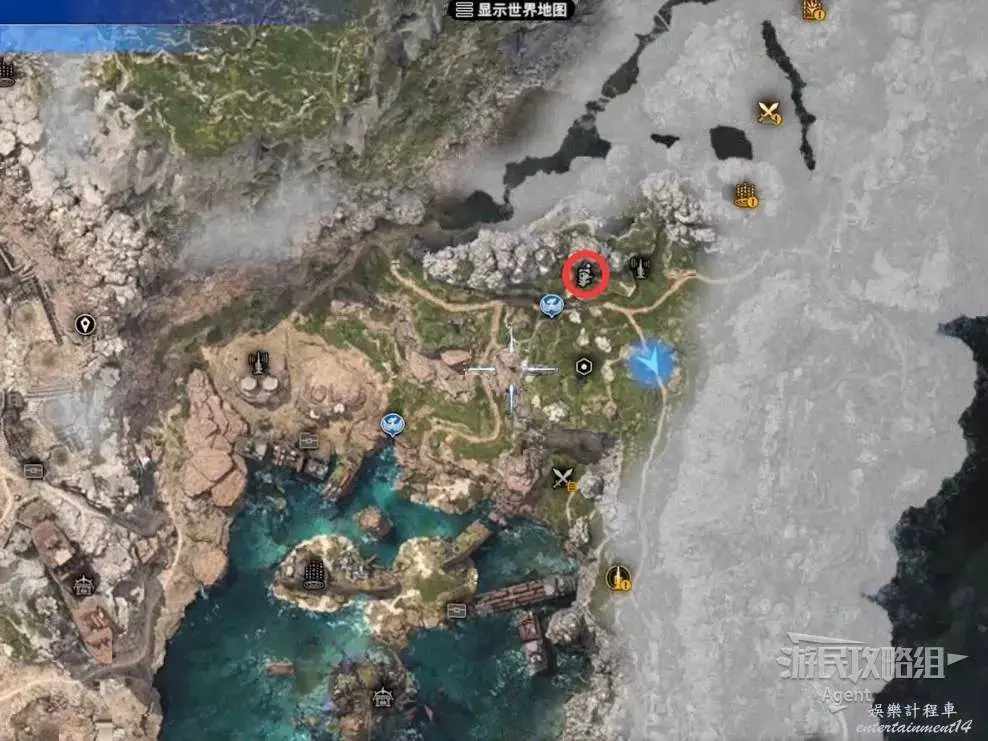 最後一處古代物質在地圖東北角的山區頂部,剛才如果已經探索過了,就不必重新爬山了,就近傳送到寶箱處,然後過橋就是。