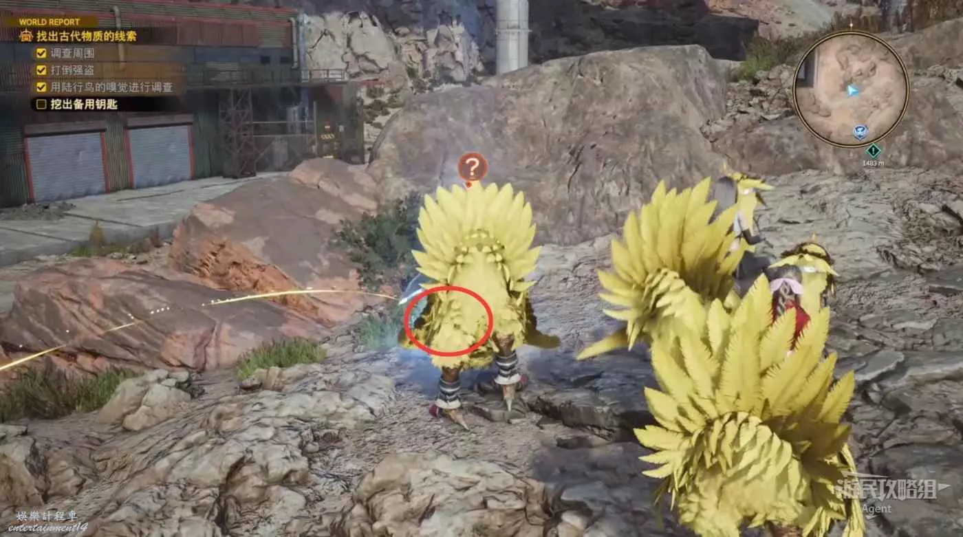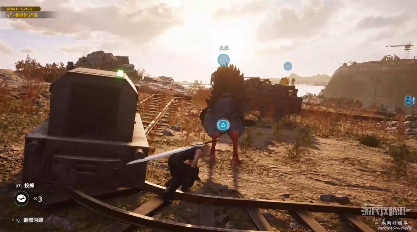 灰色的登山陸行鳥,對你扔的石頭不感興趣。先躲在草叢裡,然後迅速翻滾躲到車廂背後去。