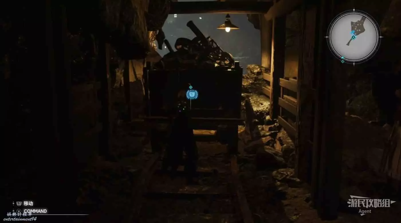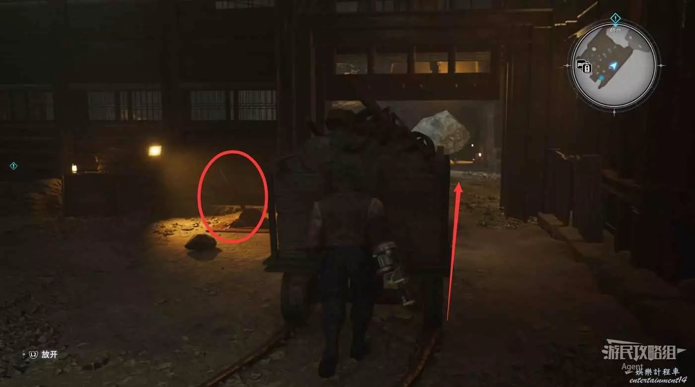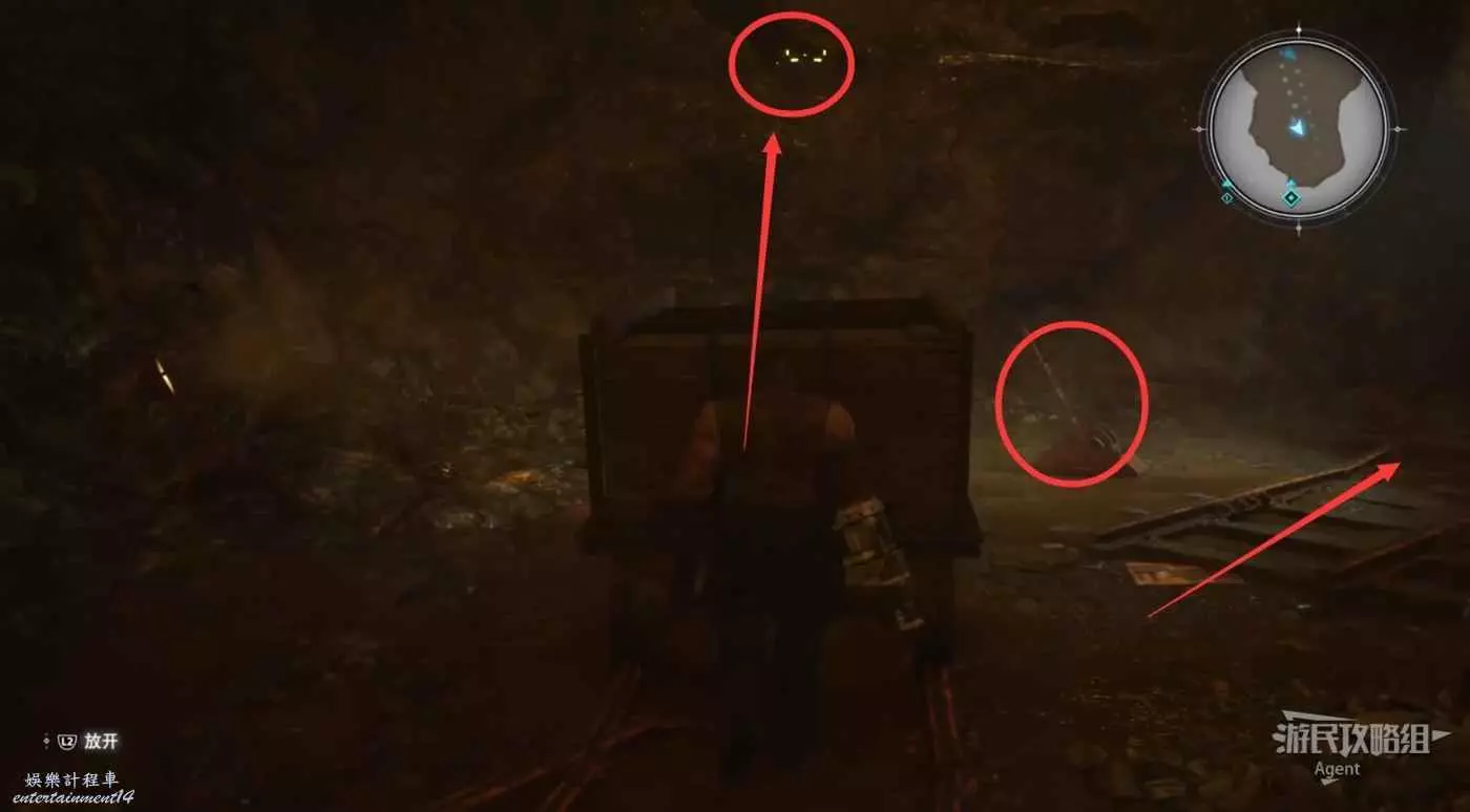 過來後,再啟動開關把遠處的第二節車廂叫過來。躲到車廂後,扔石頭砸開關,繼續跟隨車廂走。