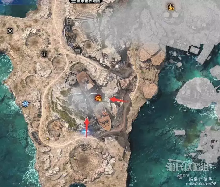海邊擱淺的船上有寶箱,有的寶箱需要爬上高處撿。
