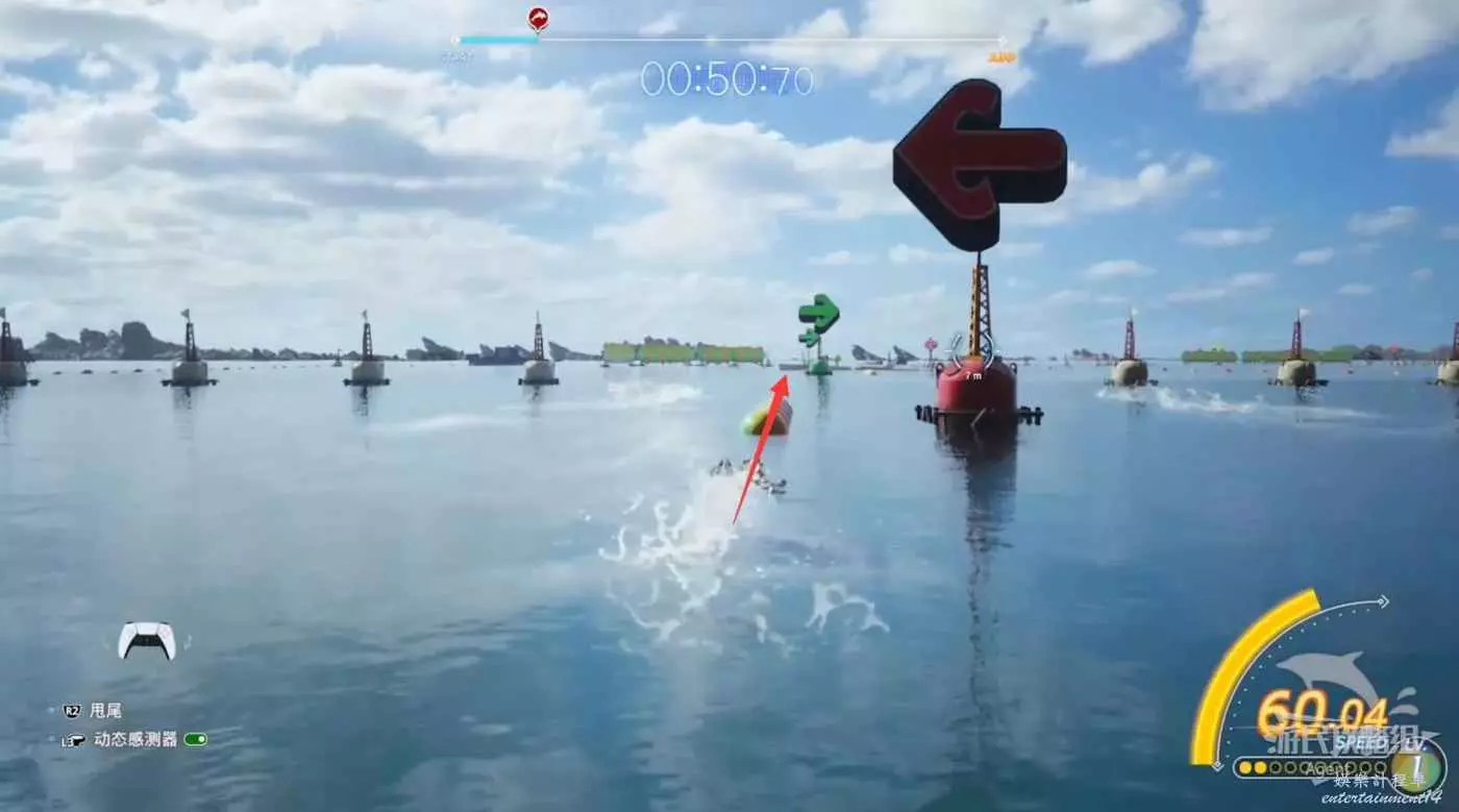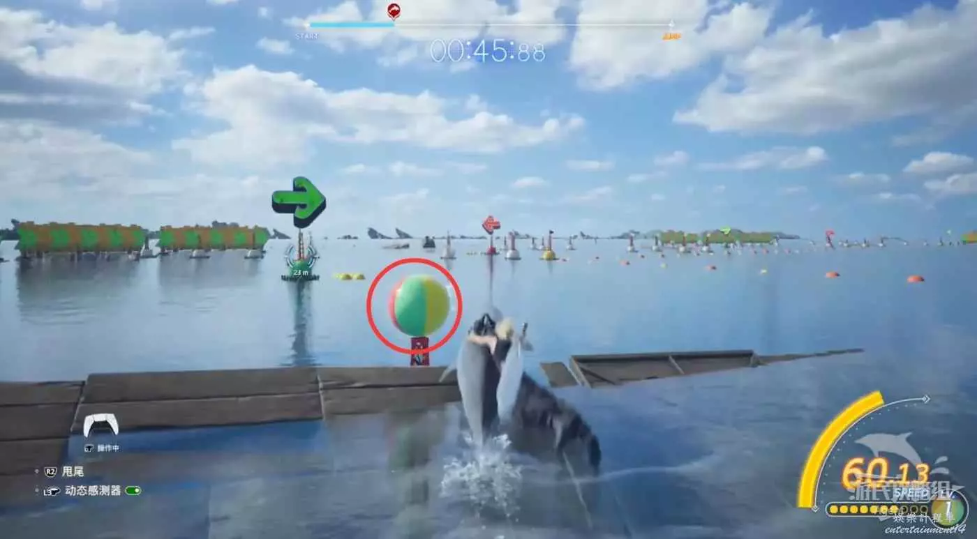 騎海豚時注意箭頭,箭頭前會有一排氣球,向著這排氣球撞過去可以提速。同時還要小心別撞到障礙物,保持高速到終點,跳上去操作起重機。
