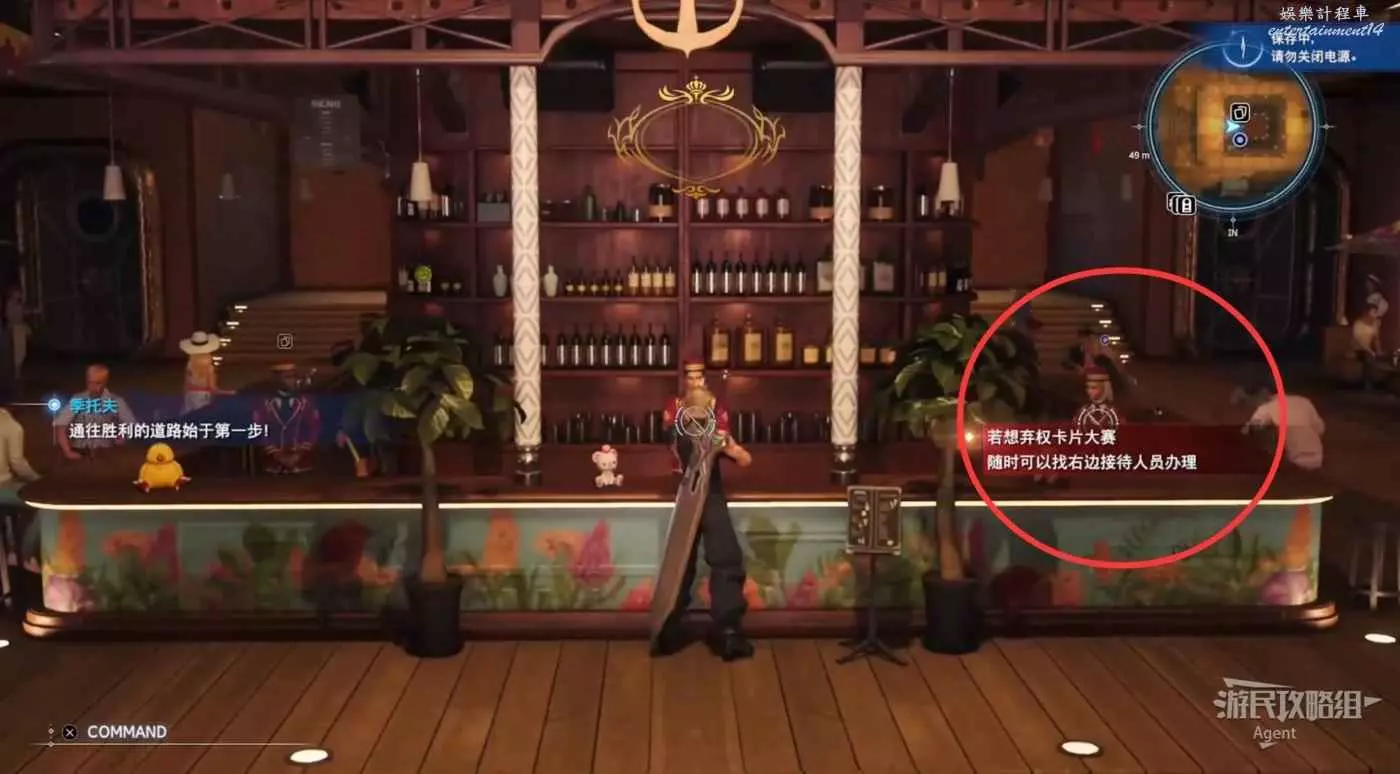 和隊友們對話後,報名參加卡牌比賽。左邊是卡片商店,想棄權的話找右邊的接待人員。