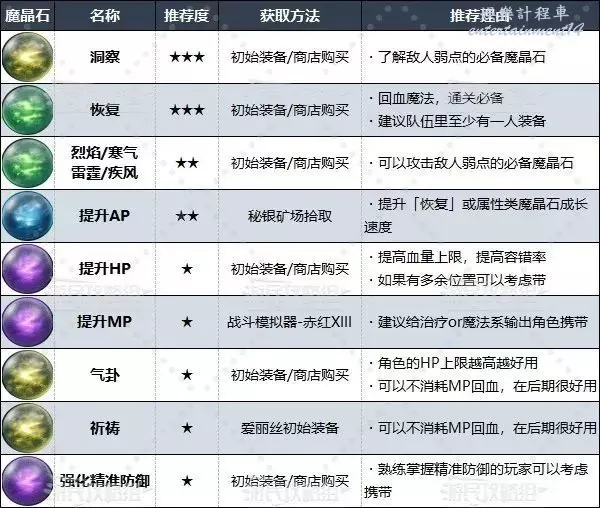 洞察、恢復魔晶石無論是應對BOSS還是小怪實用度都很高,所以當做必帶魔晶石來對待吧。屬性魔法魔晶石要針對弱點使用,使用頻率較高;提升AP是給主力帶用於強化的。其他的比較推薦像提升HP/MP、防禦等強化類魔晶石。不過通關之後比較好用的氣卦、祈禱也可以從前期就可以開始升級。