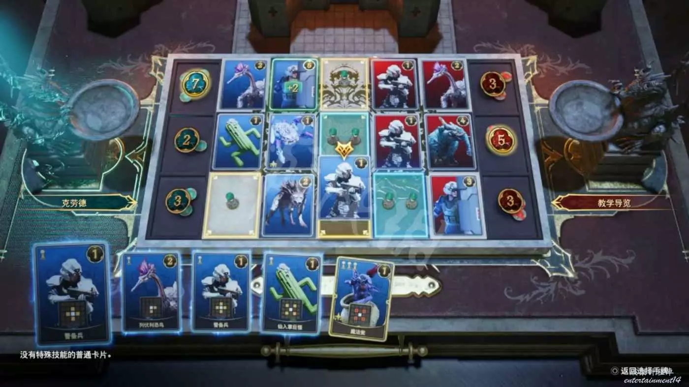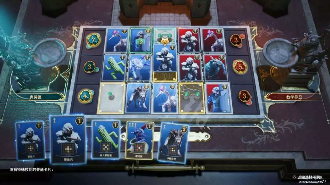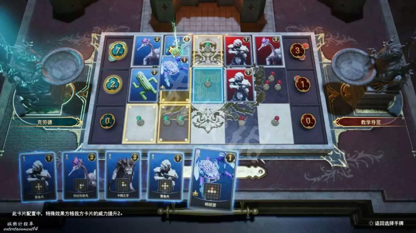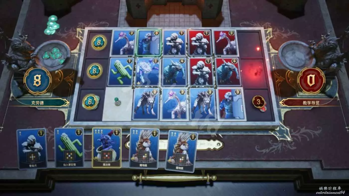 在“女王之血”遊戲中,玩家輪流在盤面上放置卡片後,通過比較每一行上積累的戰力值來得出勝負。